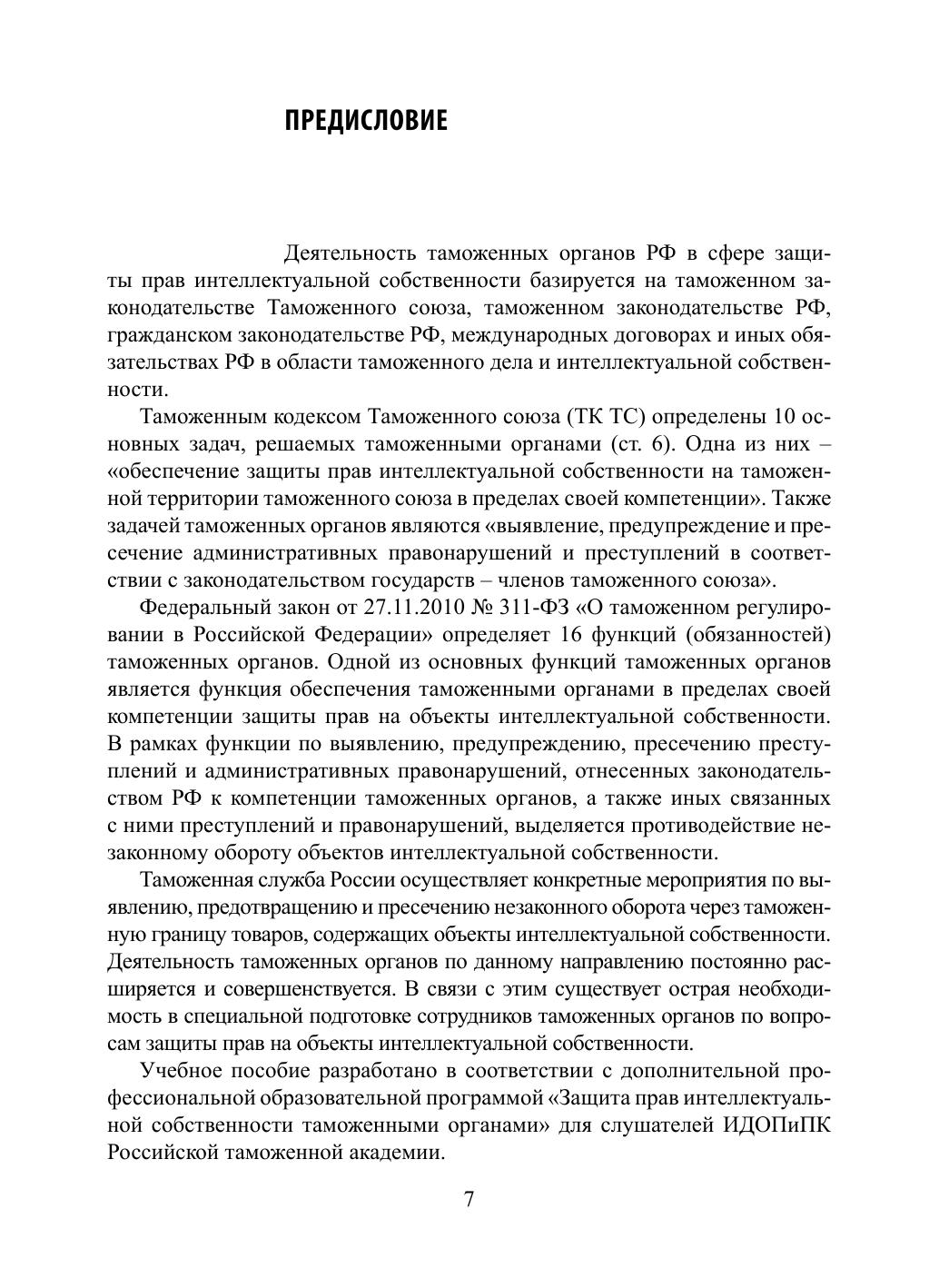 В учебном пособии раскрываются правовые основы интеллектуальной собственности (на международном и национальном уровнях); формы передачи исключительных прав на объекты интеллектуальной собственности; виды нарушений исключительных прав на объекты интеллектуальной собственности; меры по защите прав интеллектуальной собственности, принимаемые таможенными органами, и порядок таможенного контроля товаров, содержащих объекты интеллектуальной собственности. Предназначено для слушателей Института дистанционного обучения, переподготовки и повышения квалификации, факультетов повышения квалификации филиалов Российской таможенной академии, а также может быть использовано должностными лицами таможенных органов в практической деятельности.