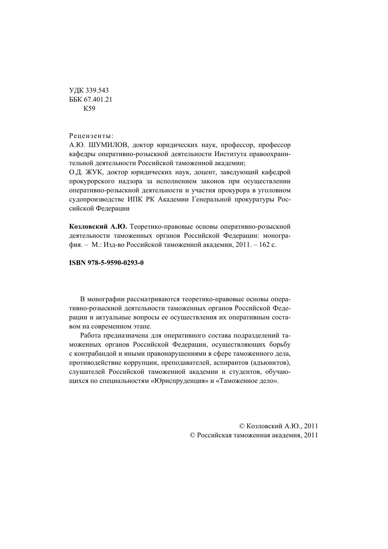 Работа предназначена для оперативного состава подразделений таможенных органов Российской Федерации, осуществляющих борьбу с контрабандой и иными правонарушениями в сфере таможенного дела, противодействие коррупции, преподавателей, аспирантов (адъюнктов), слушателей Российской таможенной академии и студентов, обучающихся по специальностям «Юриспруденция» и «Таможенное дело».