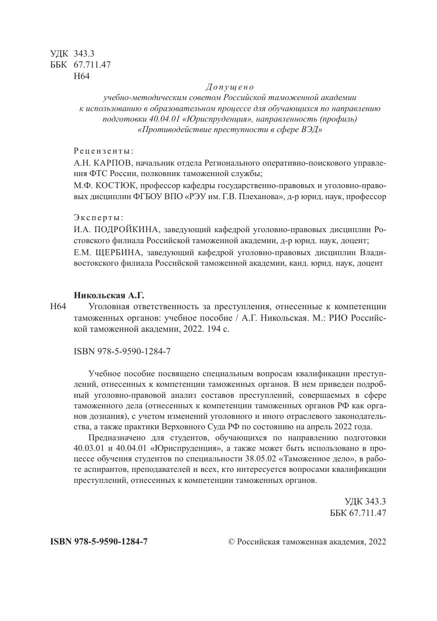 Предназначено для студентов, обучающихся по направлению подготовки 40.03.01 и 40.04.01 «Юриспруденция», а также может быть использовано в процессе обучения студентов по специальности 38.05.02 «Таможенное дело», в работе аспирантов, преподавателей и всех, кто интересуется вопросами квалификации преступлений, отнесенных к компетенции таможенных органов.
