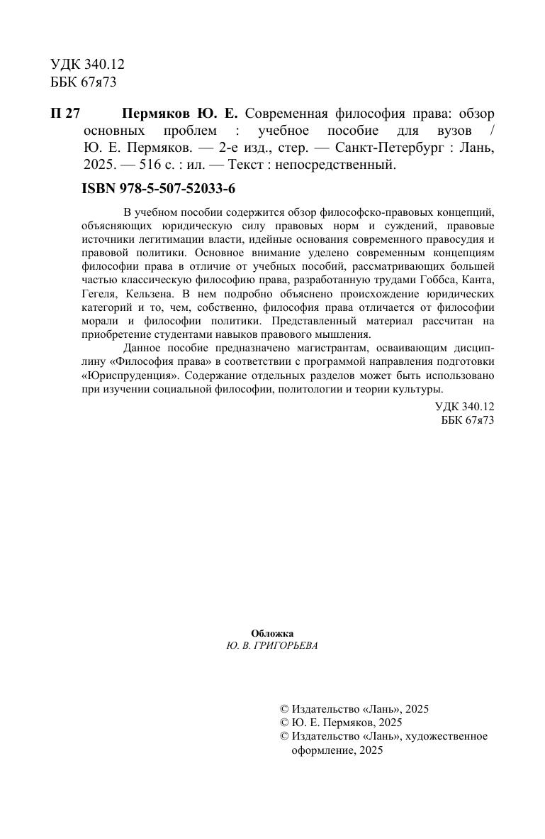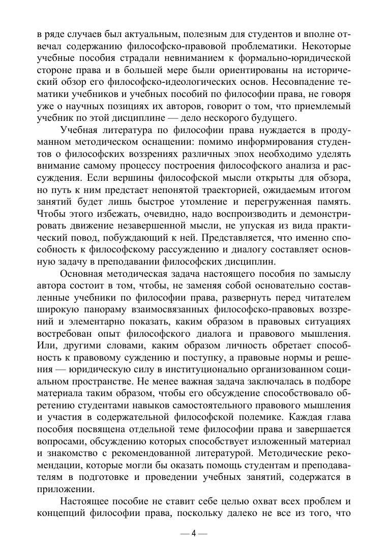 В учебном пособии содержится обзор философско-правовых концепций, объясняющих юридическую силу правовых норм и суждений, правовые источники легитимации власти, идейные основания современного правосудия и правовой политики. Основное внимание уделено современным концепциям философии права в отличие от учебных пособий, рассматривающих большей частью классическую философию права, разработанную трудами Гоббса, Канта, Гегеля, Кельзена. В нем подробно объяснено происхождение юридических категорий и то, чем, собственно, философия права отличается от философии морали и философии политики. Представленный материал рассчитан на приобретение студентами навыков правового мышления. Данное пособие предназначено магистрантам, осваивающим дисциплину «Философия права» в соответствии с программой направления подготовки «Юриспруденция». Содержание отдельных разделов может быть использовано при изучении социальной философии, политологии и теории культуры.