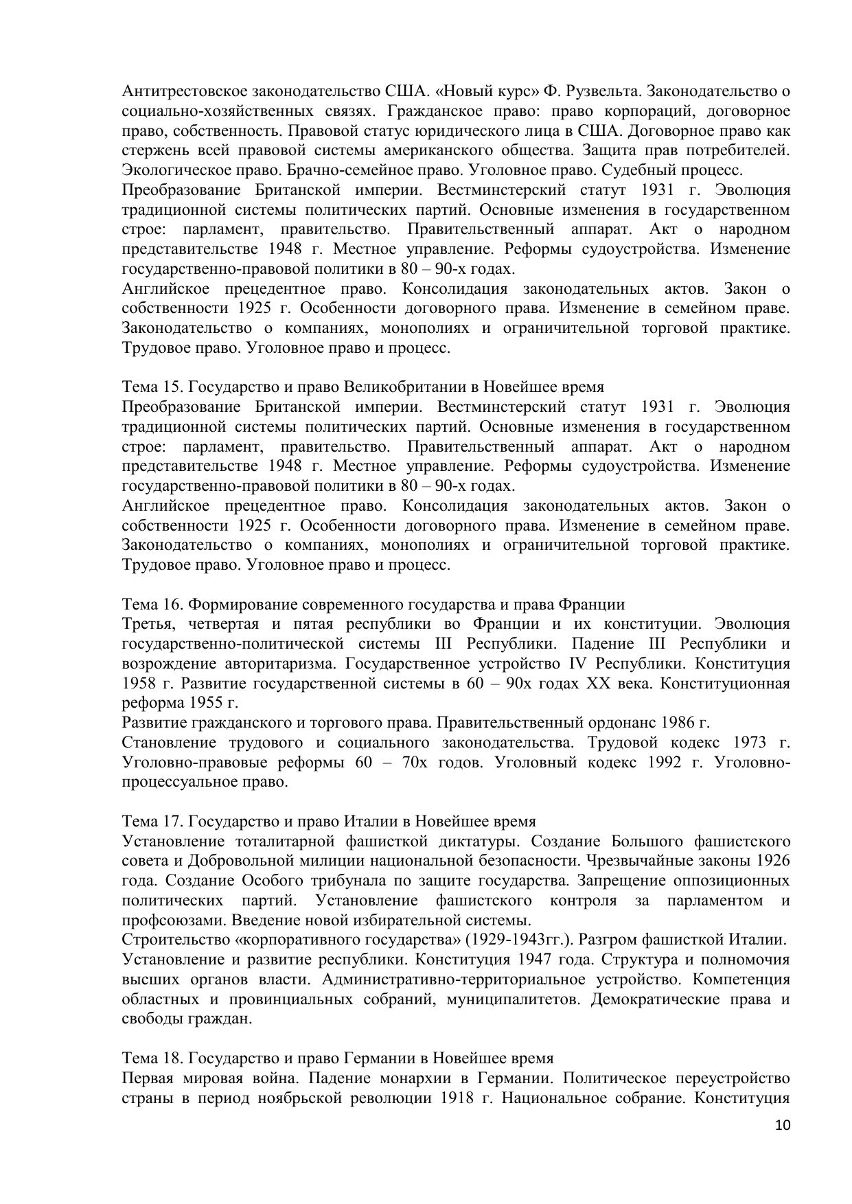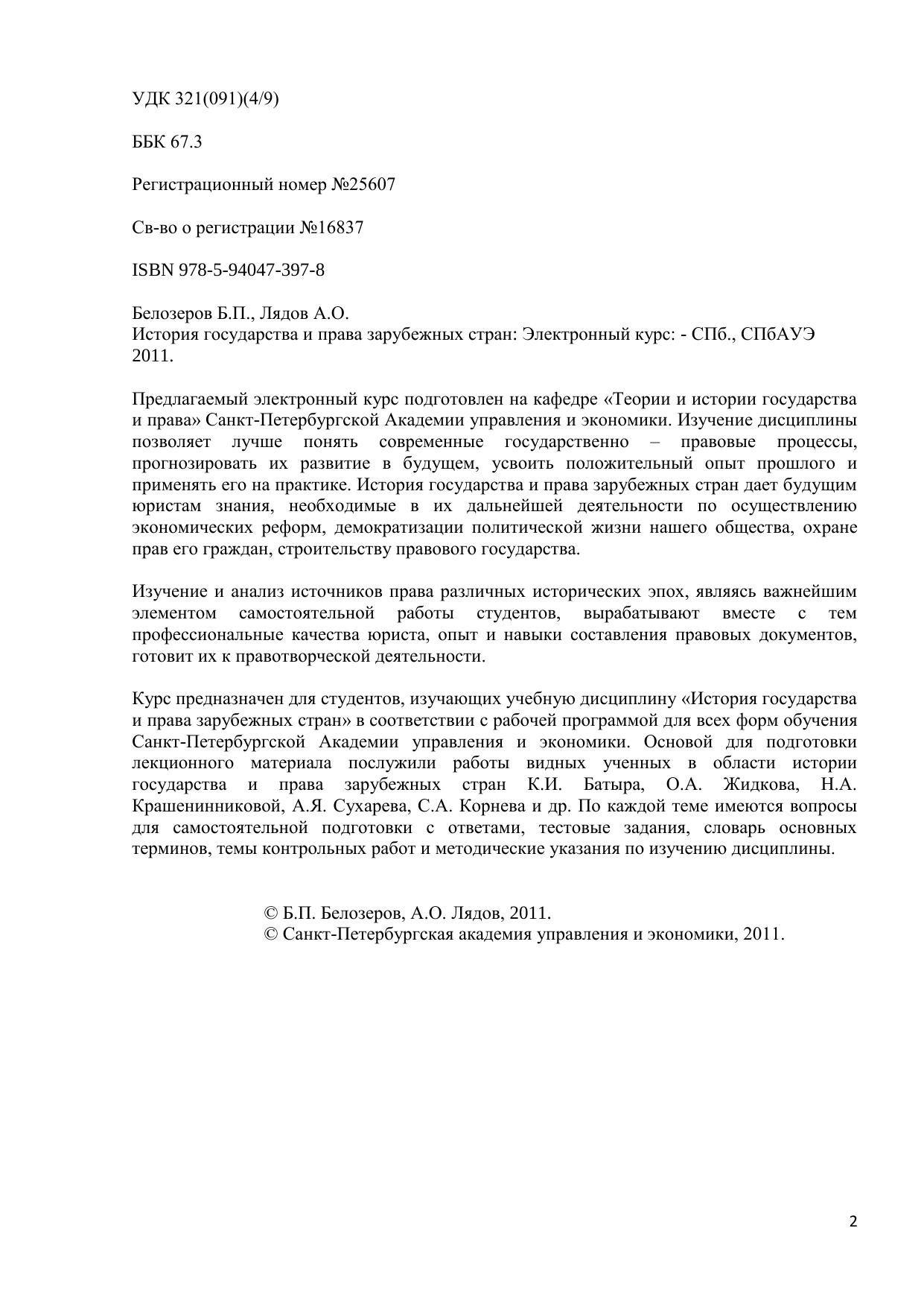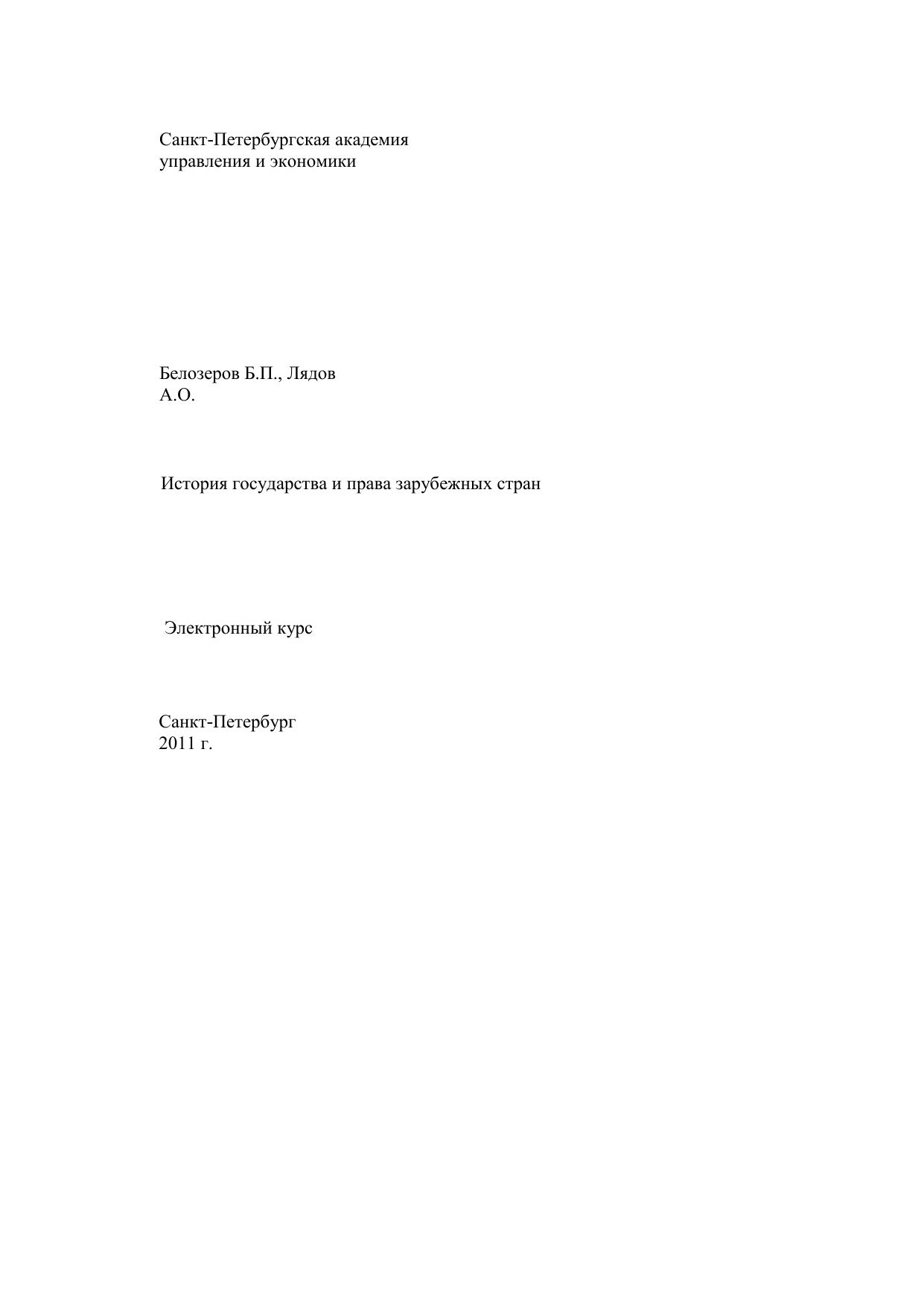 Предлагаемый электронный курс подготовлен на кафедре «Теории и истории государства и права» Санкт-Петербургской Академии управления и экономики. Изучение дисциплины позволяет лучше понять современные государственно – правовые процессы, прогнозировать их развитие в будущем, усвоить положительный опыт прошлого и применять его на практике. История государства и права зарубежных стран дает будущим юристам знания, необходимые в их дальнейшей деятельности по осуществлению экономических реформ, демократизации политической жизни нашего общества, охране прав его граждан, строительству правового государства. Изучение и анализ источников права различных исторических эпох, являясь важнейшим элементом самостоятельной работы студентов, вырабатывают вместе с тем профессиональные качества юриста, опыт и навыки составления правовых документов, готовит их к правотворческой деятельности. Курс предназначен для студентов, изучающих учебную дисциплину «История государства и права зарубежных стран» в соответствии с рабочей программой для всех форм обучения Санкт-Петербургской Академии управления и экономики. Основой для подготовки лекционного материала послужили работы видных ученных в области истории государства и права зарубежных стран К.И. Батыра, О.А. Жидкова, Н.А. Крашенинниковой, А.Я. Сухарева, С.А. Корнева и др. По каждой теме имеются вопросы для самостоятельной подготовки с ответами, тестовые задания, словарь основных терминов, темы контрольных работ и методические указания по изучению дисциплины.