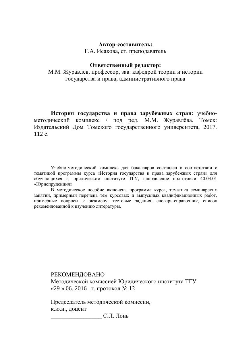 Учебно-методический комплекс для бакалавров составлен в соответствии с тематикой программы курса «История государства и права зарубежных стран» для обучающихся в юридическом институте ТГУ, направление подготовки 40.03.01 «Юриспруденция». В методическое пособие включена программа курса, тематика семинарских занятий, примерный перечень тем курсовых и выпускных квалификационных работ, примерные вопросы к экзамену, тестовые задания, словарь-справочник, список рекомендованной к изучению литературы.