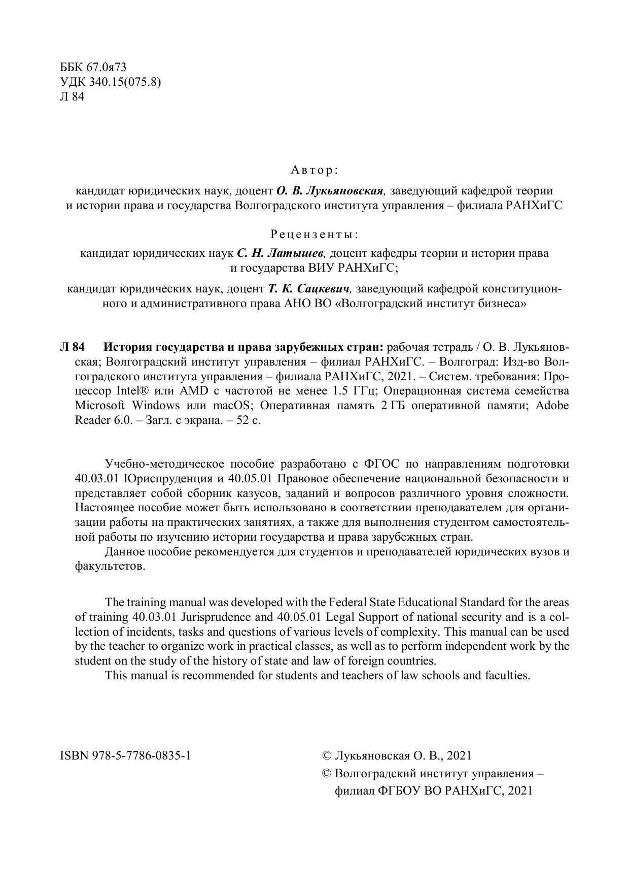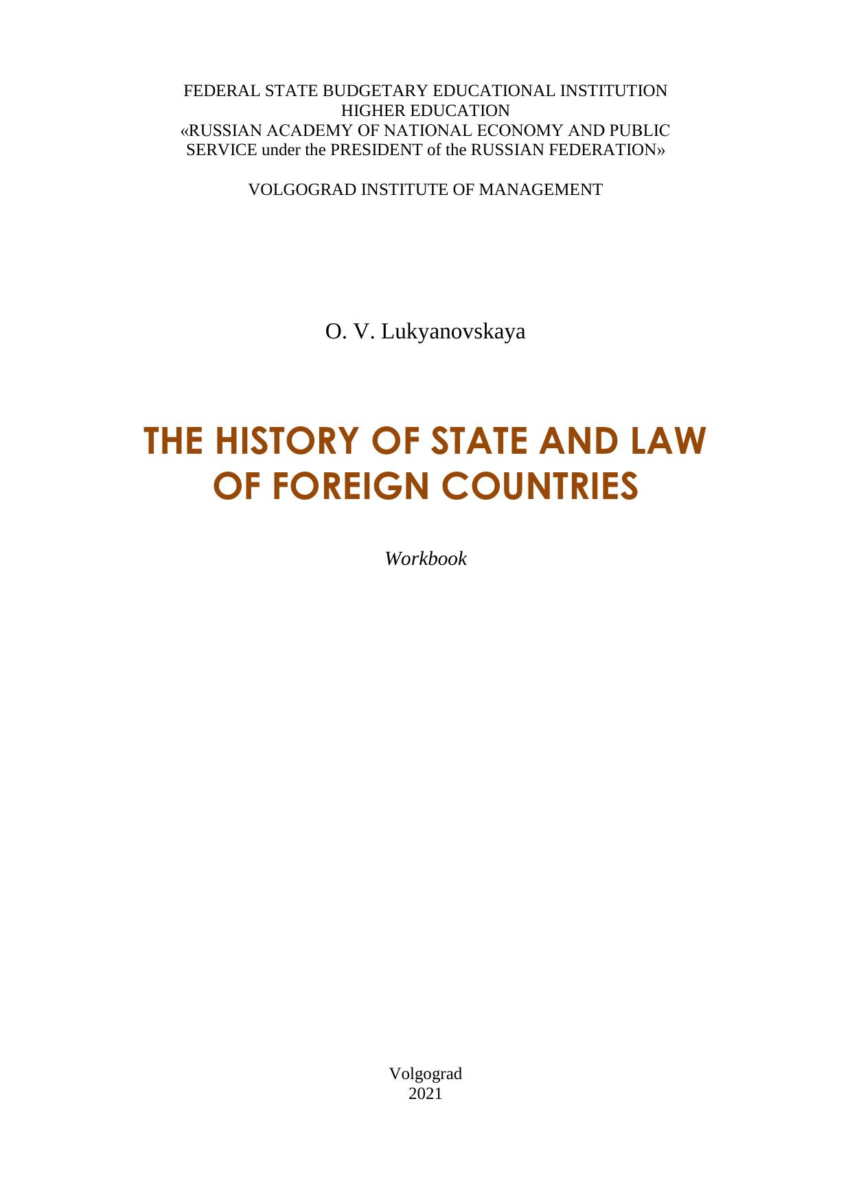Учебно-методическое пособие разработано с ФГОС по направлениям подготовки 40.03.01 Юриспруденция и 40.05.01 Правовое обеспечение национальной безопасности и представляет собой сборник казусов, заданий и вопросов различного уровня сложности. Настоящее пособие может быть использовано в соответствии преподавателем для организации работы на практических занятиях, а также для выполнения студентом самостоятельной работы по изучению истории государства и права зарубежных стран. Данное пособие рекомендуется для студентов и преподавателей юридических вузов и факультетов.