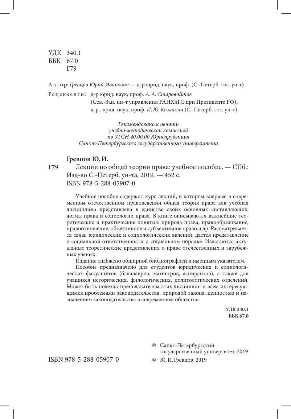 Учебное пособие содержит курс лекций, в котором впервые в современном отечественном правоведении общая теория права как учебная дисциплина представлена в единстве своих основных составляющих: догмы права и социологии права. В книге описываются важнейшие теоретические и практические понятия: природа права, правообразование, правоотношение, объективное и субъективное право и др. Рассматривается связь юридических и социологических явлений, дается представление о социальной ответственности и социальном порядке. Излагаются актуальные теоретические представления о праве отечественных и зарубежных ученых. Издание снабжено обширной библиографией и именным указателем. Пособие предназначено для студентов юридических и социологических факультетов (бакалавров, магистров, аспирантов), а также для учащихся исторических, филологических, политологических отделений. Может быть полезно преподавателям этих дисциплин и всем интересующимся проблемами законодательства, природой закона, ценностью и назначением законодательства в современном обществе.