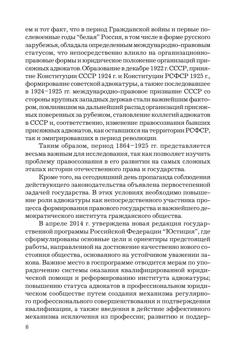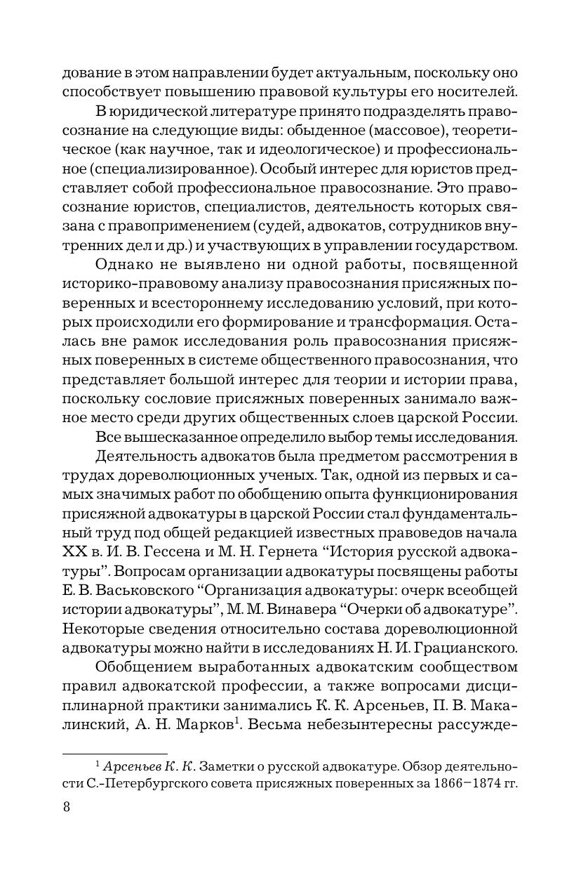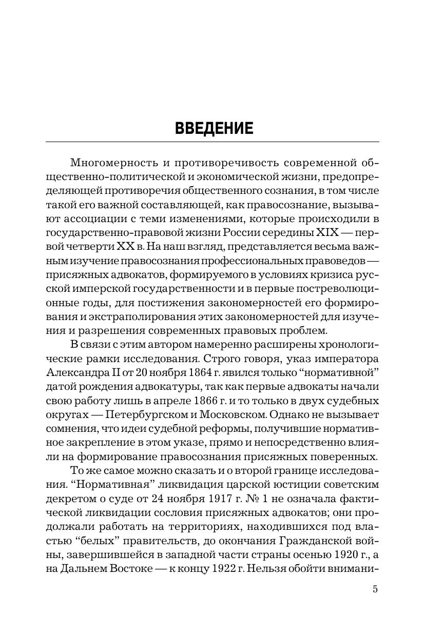 В монографии рассмотрены наиболее важные аспекты профессионального правового сознания социальной группы присяжных поверенных, формируемого в условиях кризиса русской имперской государственности, а также в постреволюционные годы. Раскрывается сущность правосознания, его структура и функции. Показаны взаимосвязь политико-правовых событий указанного периода с процессами становления, развития и трансформации института адвокатуры, особенности правосознания бывших присяжных адвокатов, эмигрировавших после Октября 1917 г. или оставшихся в Советской России.