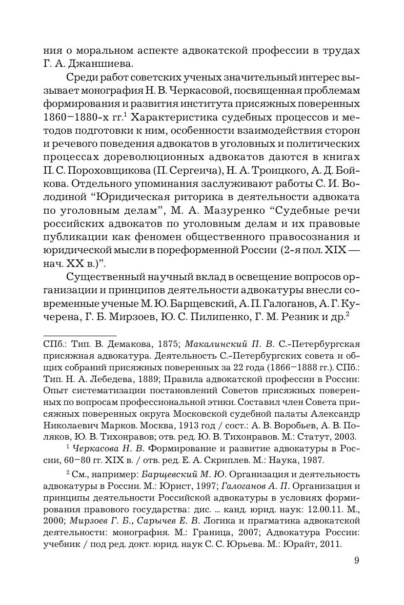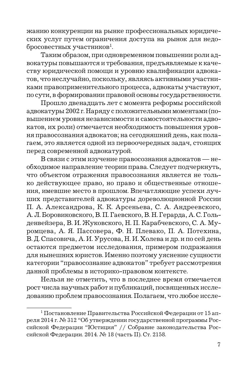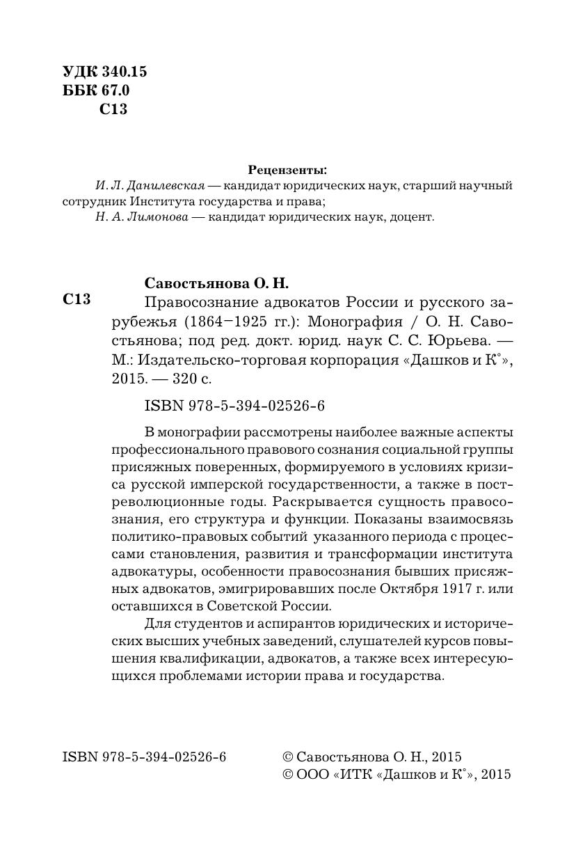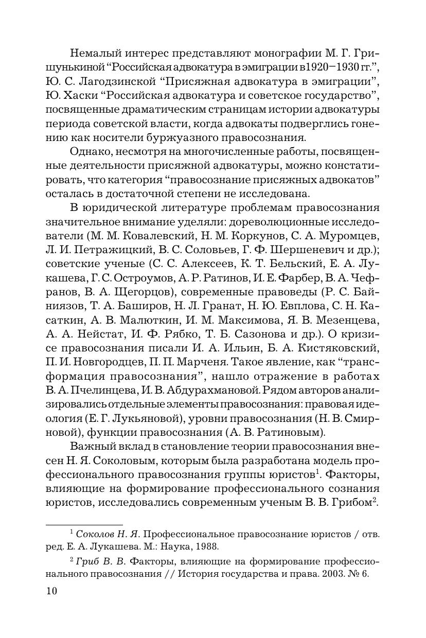 В монографии рассмотрены наиболее важные аспекты профессионального правового сознания социальной группы присяжных поверенных, формируемого в условиях кризиса русской имперской государственности, а также в постреволюционные годы. Раскрывается сущность правосознания, его структура и функции. Показаны взаимосвязь политико-правовых событий указанного периода с процессами становления, развития и трансформации института адвокатуры, особенности правосознания бывших присяжных адвокатов, эмигрировавших после Октября 1917 г. или оставшихся в Советской России.