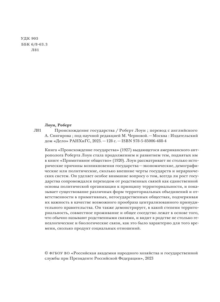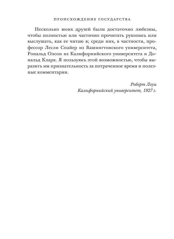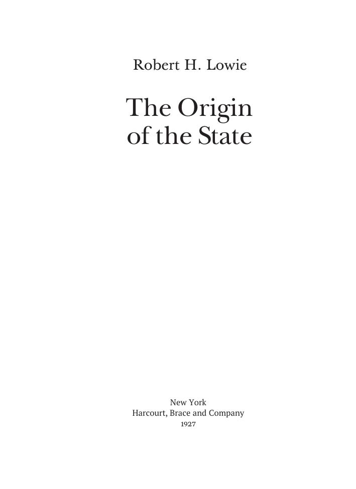 Книга «Происхождение государства» (1927) выдающегося американского антрополога Роберта Лоуи стала продолжением и развитием тем, поднятых им в книге «Примитивное общество» (1920). Лоуи рассматривает не столько исторические причины возникновения государства — экономические, демографические или политические, сколько внешние черты государств и иерархических систем. Он уделяет особое внимание вопросу о том, всегда ли рост государства сопровождался переходом от родственных связей как единственной основы политической организации к принципу территориальности, и показывает существование различных форм территориальных объединений и ответственности в примитивных, негосударственных обществах, подчеркивая их важность в качестве возможного прообраза централизованного принудительного правительства. Он также демонстрирует, в какой степени территориальность, совместное проживание и общее соседство лежат в основе того, что обычно называют родственными связями, и видит в родстве не столько генеалогические и биологические связи, как это было характерно для того времени, сколько продукт социальных отношений.