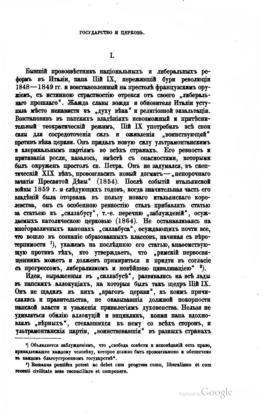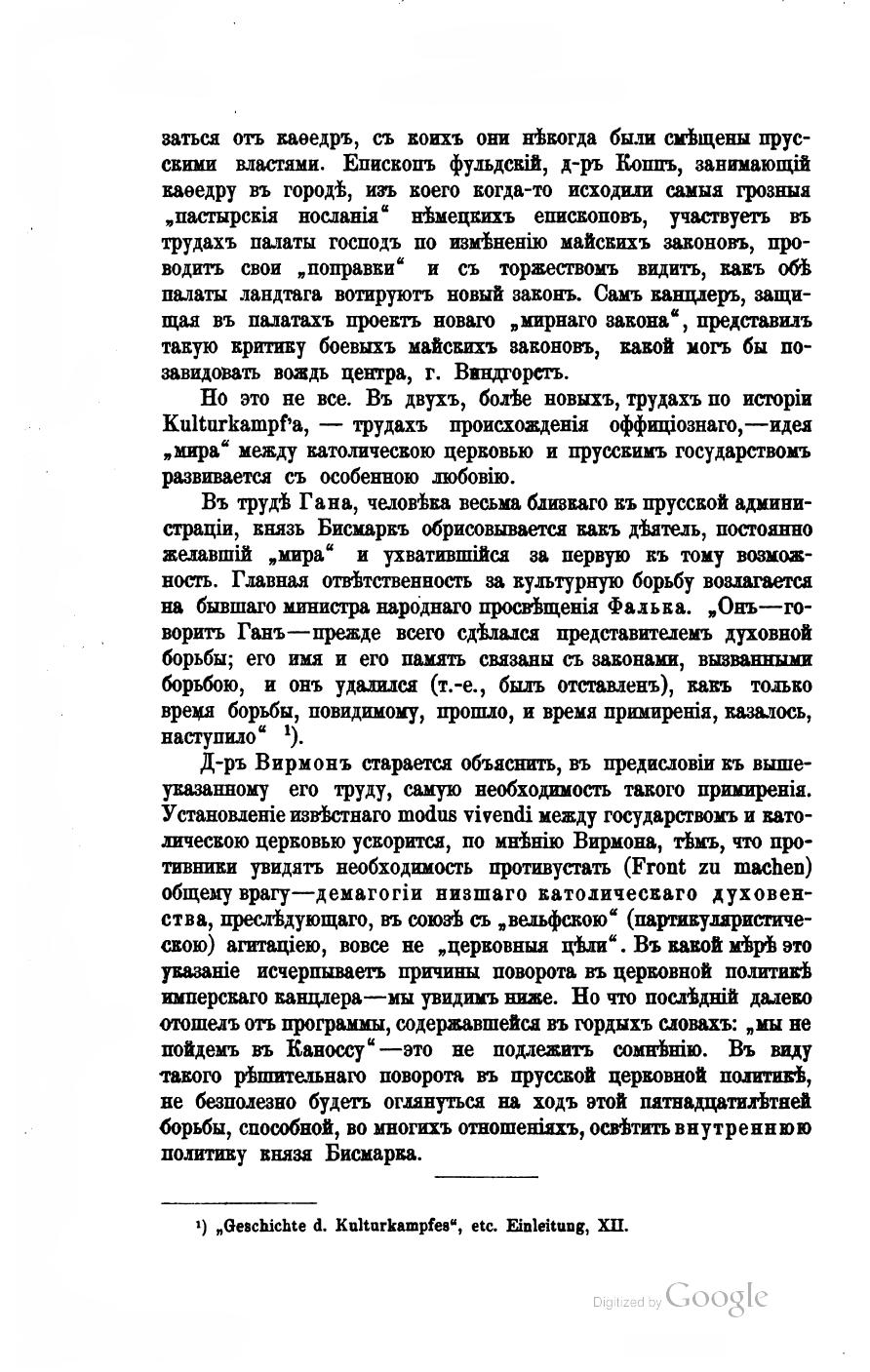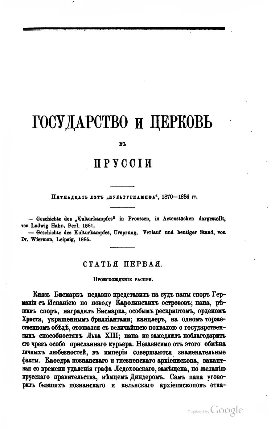 Государство и Церковь в Пруссии. Пятнадцать лет культуркампфа. Статья Первая