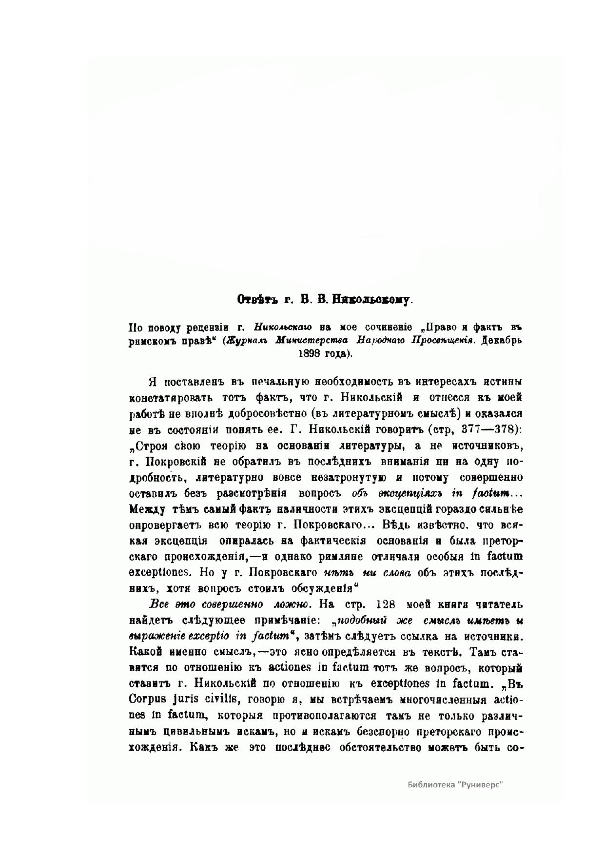 Ответ г. Б. В. Никольскому. По поводу рецензии г. Никольского на мое сочинение Право и факт в римском праве