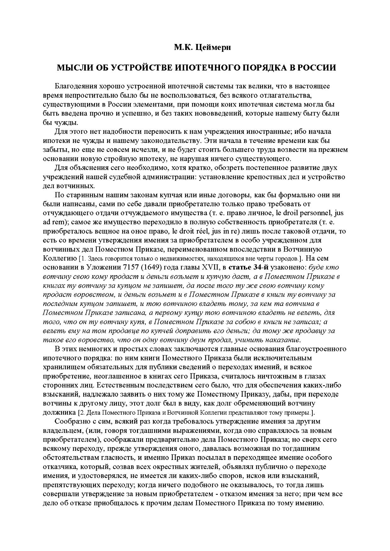 Статья: «Мысли об устройстве ипотечного порядка в России»