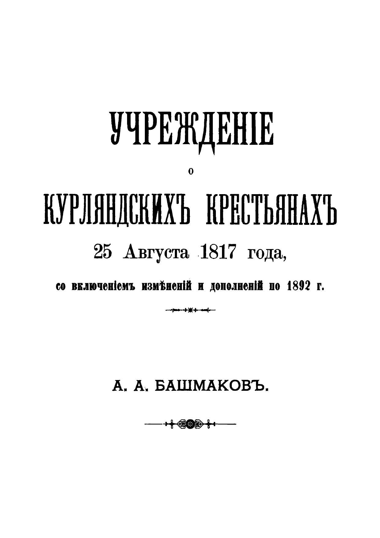 Учреждение о Курляндских крестьянах 25 августа 1817 с включением изменений и дополнений по 1892 г.