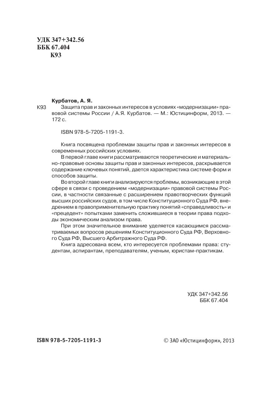 Книга посвящена проблемам защиты прав и законных интересов всовременных российских условиях.В первой главе книги рассматриваются теоретические и материаль-но-правовые основы защиты прав и законных интересов, раскрываетсясодержание ключевых понятий, дается характеристика системе форм испособов защиты.Во второй главе книги анализируются проблемы, возникающие в этойсфере в связи с проведением «модернизации» правовой системы Рос-сии, в частности связанные с расширением правотворческих функцийвысших российских судов, в том числе Конституционного Суда РФ, вне-дрением в правоприменительную практику понятий «справедливость» и«прецедент» попытками заменить сложившиеся в теории права подхо-ды экономическим анализом права.При этом значительное внимание уделяется касающимся рассма-триваемых вопросов решениям Конституционного Суда РФ, Верховно-го Суда РФ, Высшего Арбитражного Суда РФ.Книга адресована всем, кто интересуется проблемами права: сту-дентам, аспирантам, преподавателям, ученым, юристам-практикам