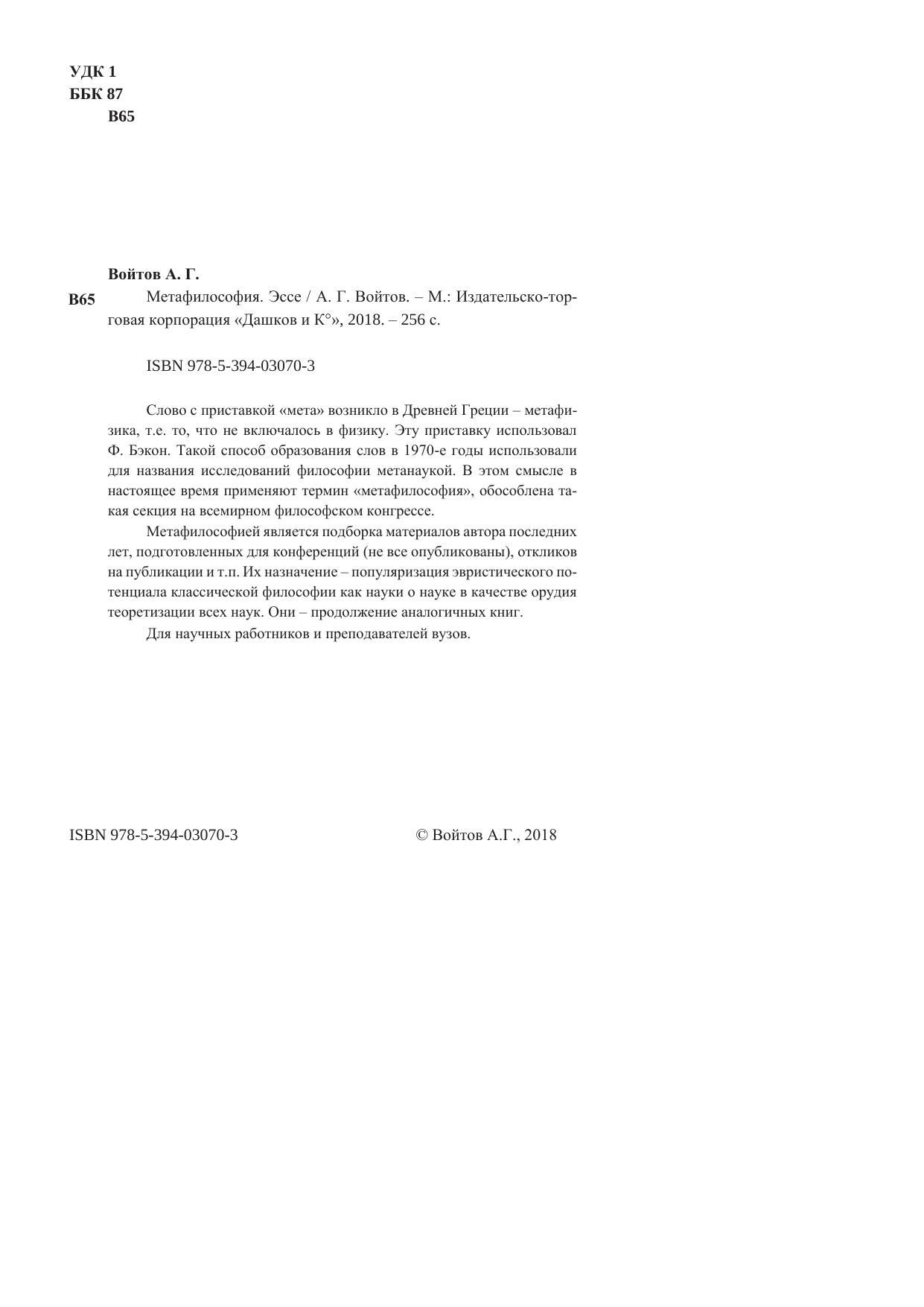 Метафилософией является подборка материалов автора последних лет, подготовленных для конференций (не все опубликованы), откликов на публикации и т.п. Их назначение - популяризация эвристического потенциала классической философии как науки о науке в качестве орудия теоретизации всех наук. Они - продолжение аналогичных книг.