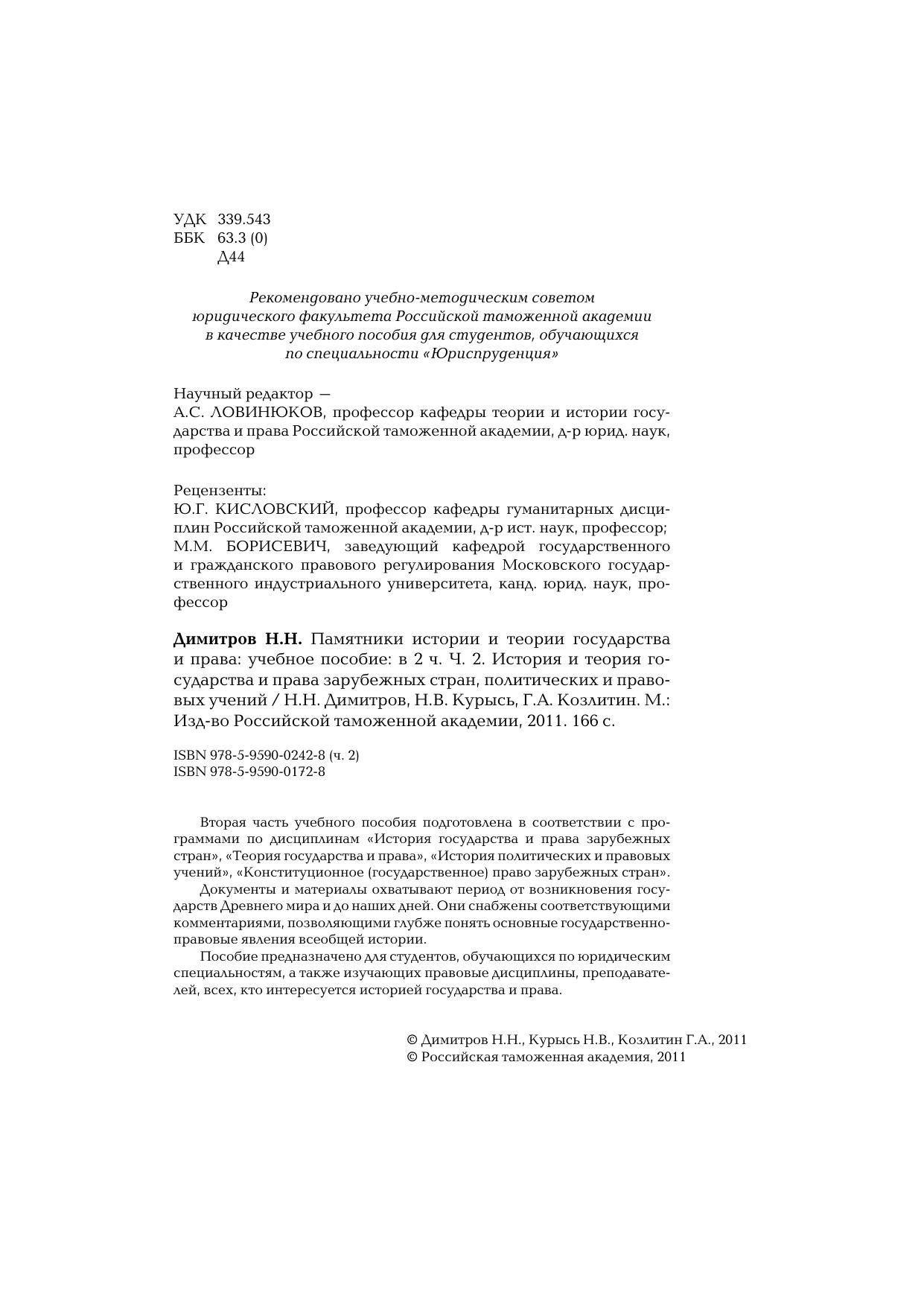 Памятники истории и теории государства и права: учебное пособие: в 2 ч. Ч. 2. История и теория государства и права зарубежных стран, политических и правовых учений