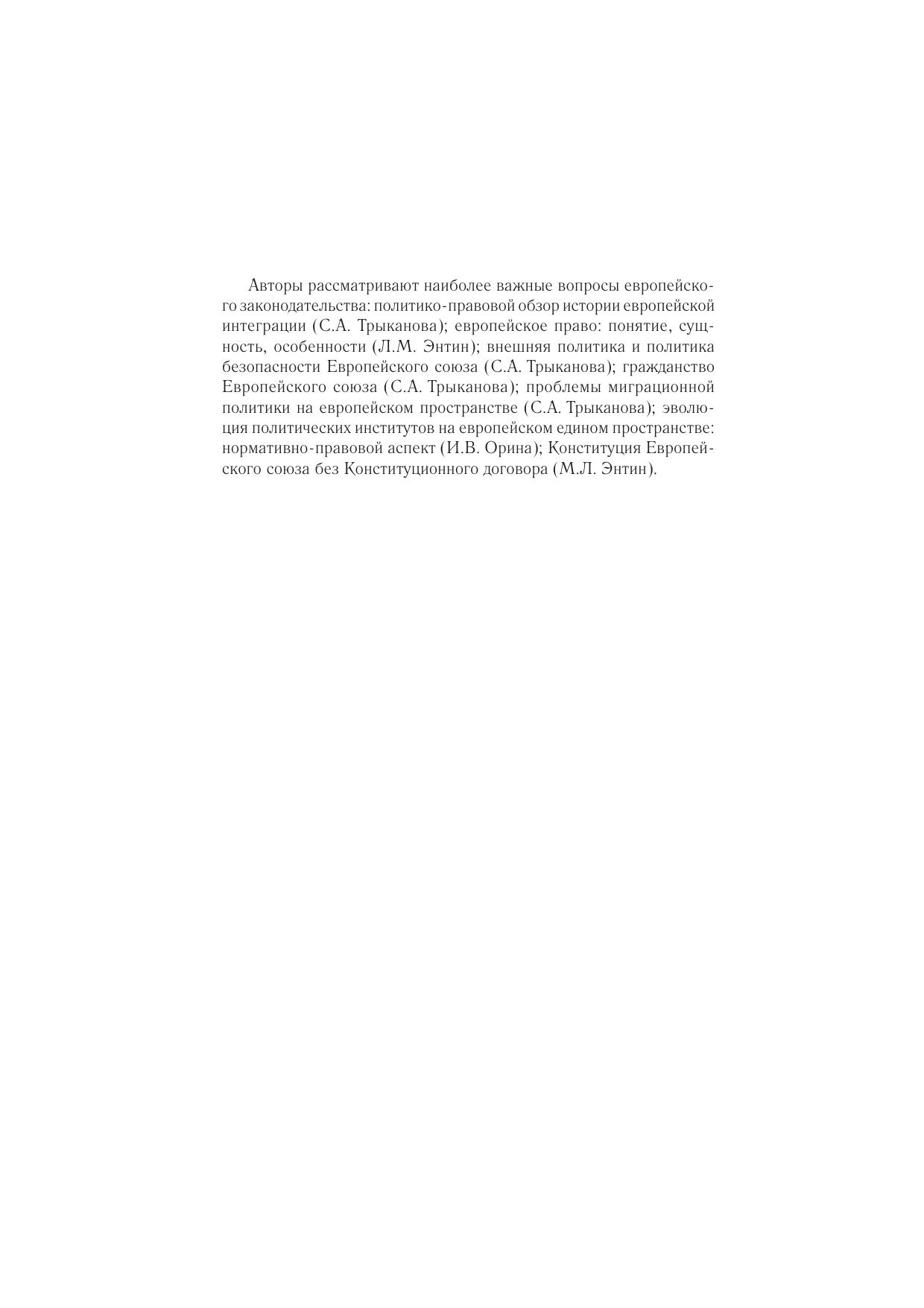 В пособии представлен политико-правовой обзор истории европейской интеграции, европейского права, рассматриваются наиболее важные вопросы: понятие, сущность, особенности; внешняя политика и политика безопасности ЕС; гражданство ЕС; проблемы миграционной политики на европейском пространстве; эволюция политических институтов: нормативно-правовой аспект; Конституция ЕС без Конституционного договора. Для студентов, аспирантов и преподавателей юридических факультетов вузов..