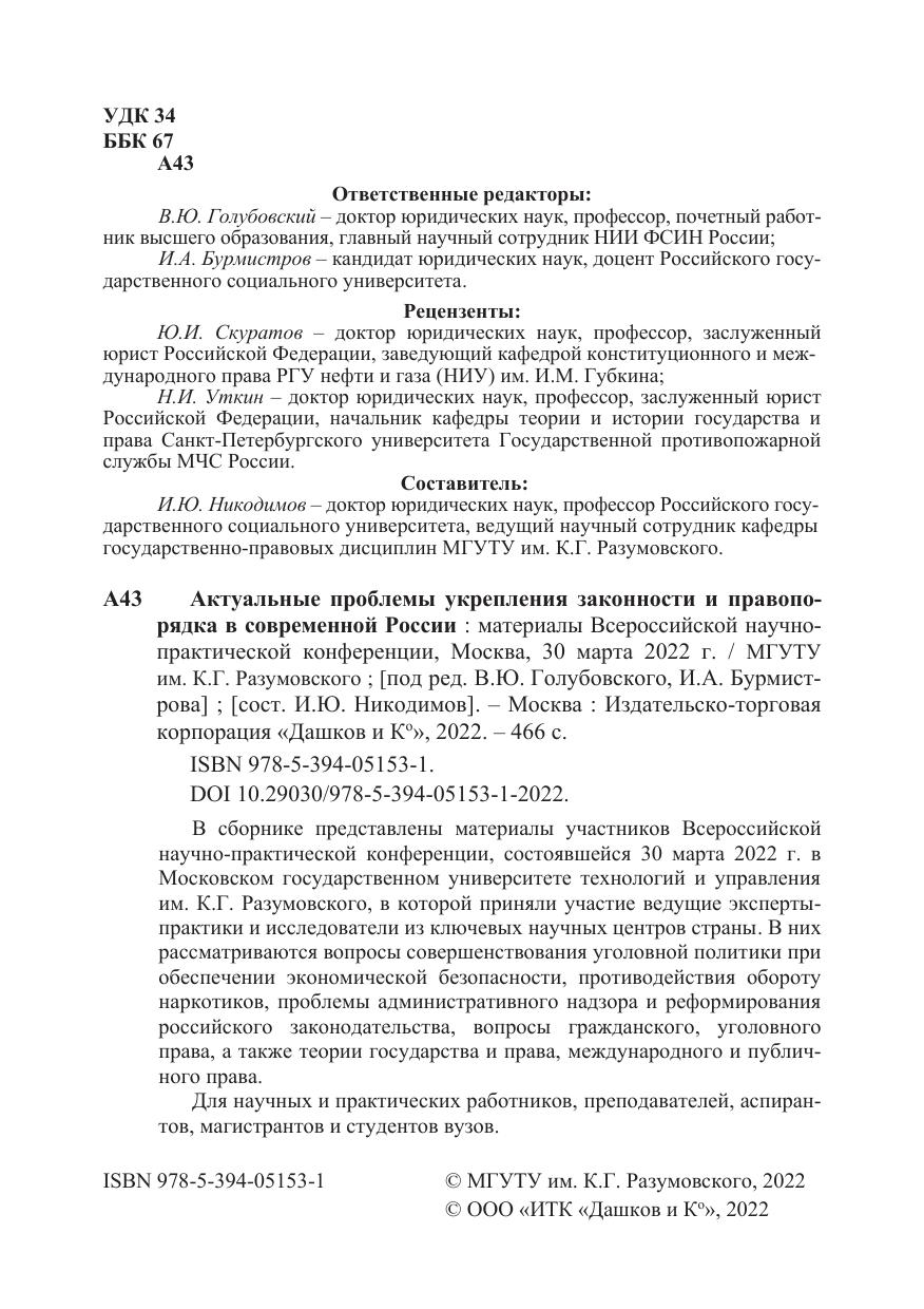 В сборнике представлены материалы участников Всероссийской научно-практической конференции, состоявшейся 30 марта 2022 г. в Московском государственном университете технологий и управления им. К.Г. Разумовского, в которой приняли участие ведущие эксперты-практики и исследователи из ключевых научных центров страны. В них рассматриваются вопросы совершенствования уголовной политики при обеспечении экономической безопасности, противодействия обороту наркотиков, проблемы административного надзора и реформирования российского законодательства, вопросы гражданского, уголовного права, а также теории государства и права, международного и публичного права.