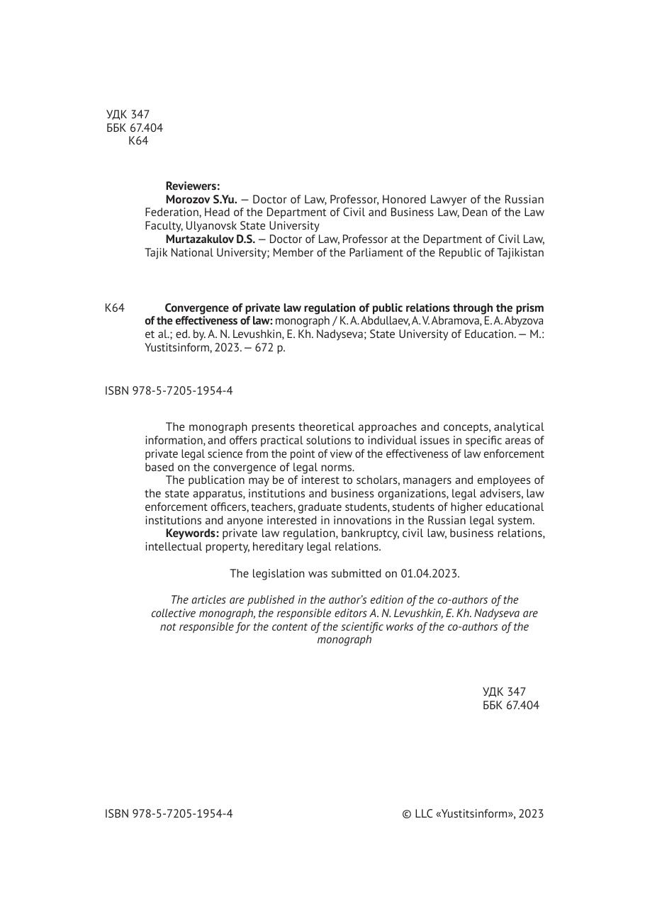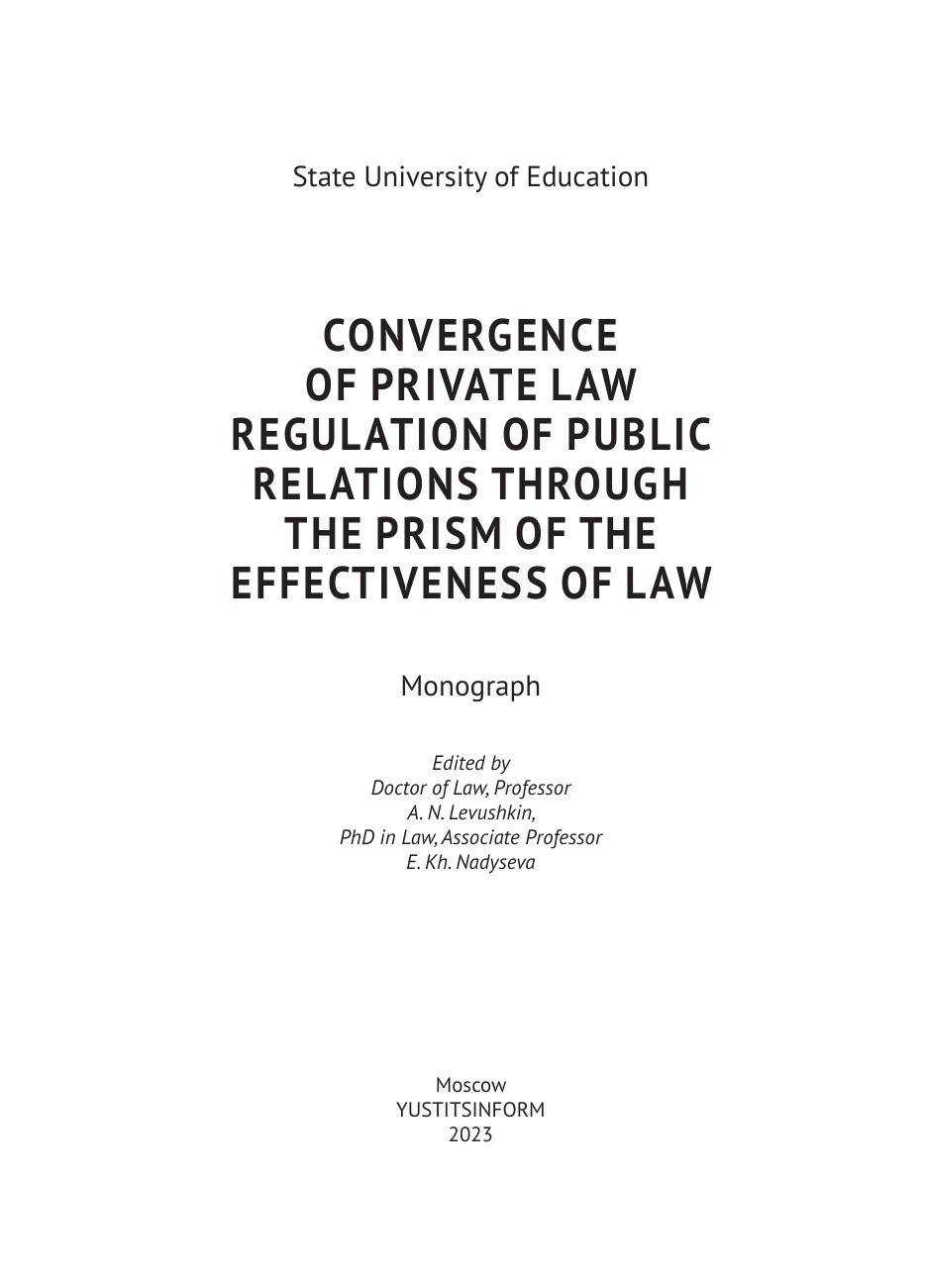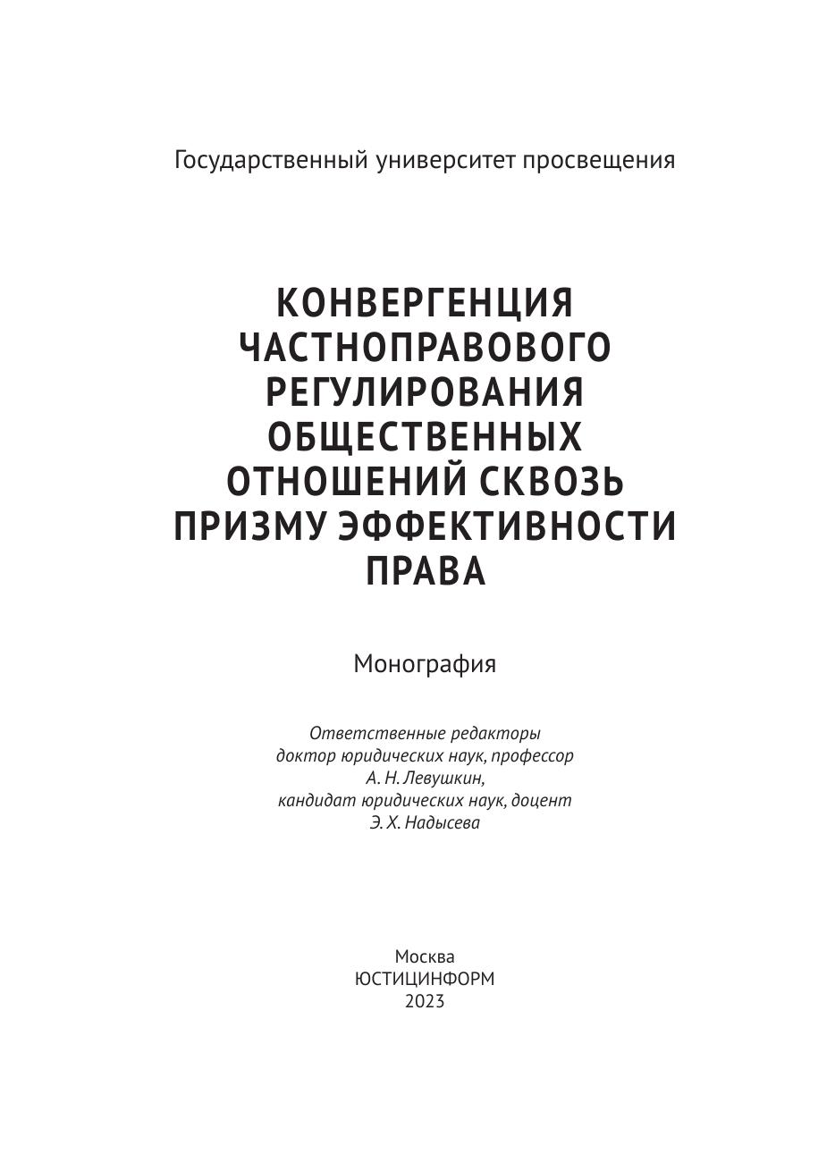 В монографии изложены теоретические подходы и концепции, аналитическая информация, предложены практические решения отдельных проблем в конкретных областях частноправовой юридической науки с точки зрения эффективности правоприменения на основе конвергенции норм права. Издание может быть интересно ученым, руководителям и служащим государственного аппарата, учреждений и хозяйственных организаций, юрисконсультам, сотрудникам правоохранительных органов, педагогам, аспирантам, студентам высших учебных учреждений и всем, кто интересуется проблемами новаций в российской правовой системе.