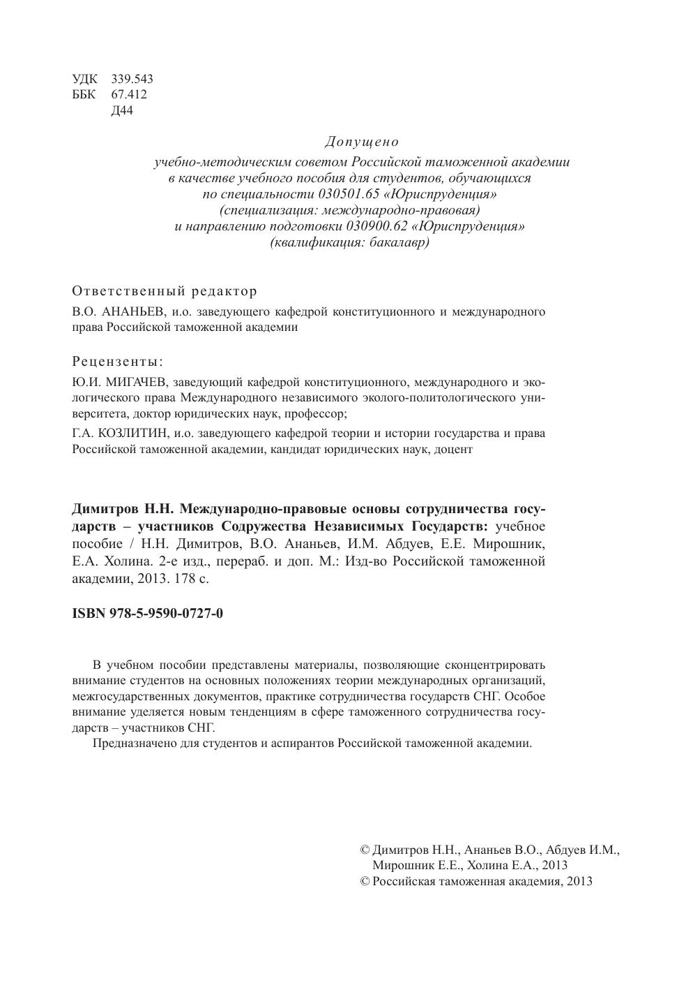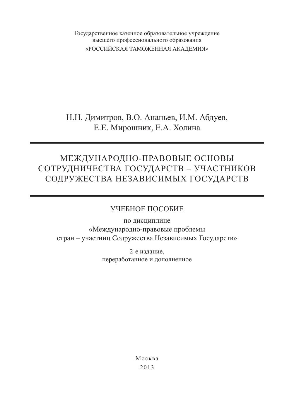 Гриф: Допущено учебно-методическим советом Российской таможенной академии в качестве учебного пособия для студентов, обучающихся по специальности 030501.65 «Юриспруденция» (специализация: международно-правовая) и направлению подготовки 030900.62 «Юриспруденция» (квалификация: бакалавр)