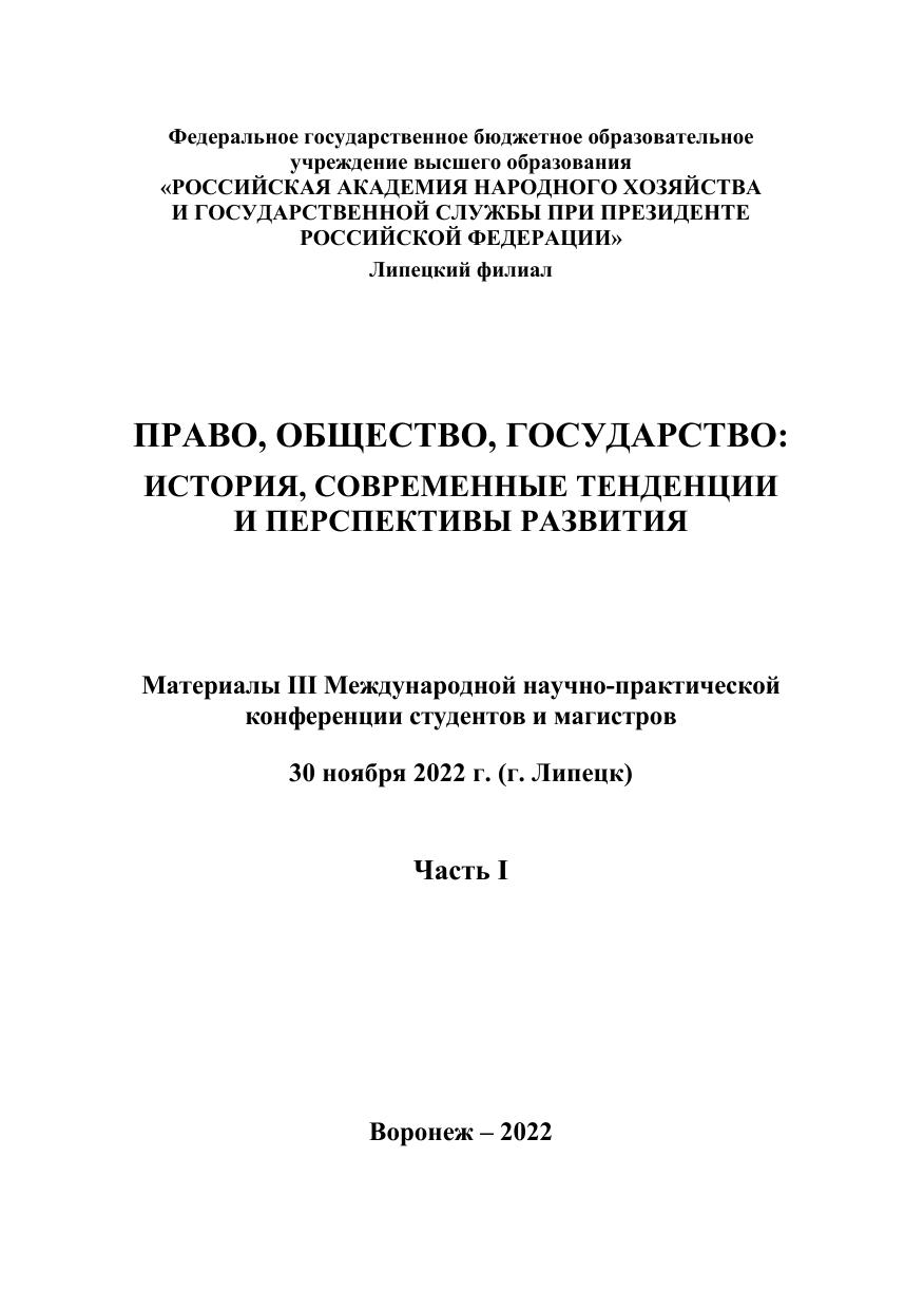 Право, общество, государство: история, современные тенденции и перспективы развития: Сборник трудов III Международной научно-практической конференции студентов и магистров. 30 ноября 2022 г. (г. Липецк). Часть I