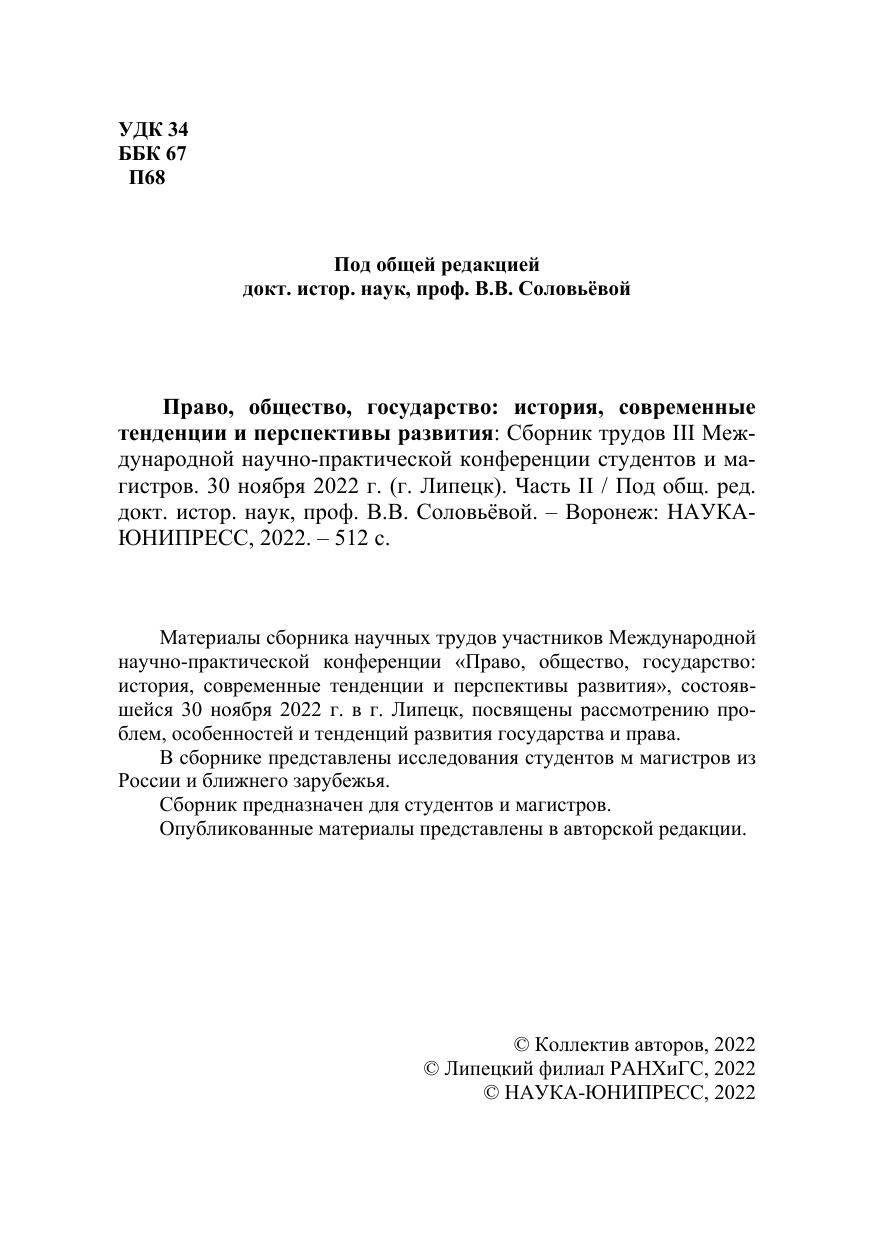 Право, общество, государство: история, современные тенденции и перспективы развития: Сборник трудов III Международной научно-практической конференции студентов и магистров. 30 ноября 2022 г. (г. Липецк). Часть II