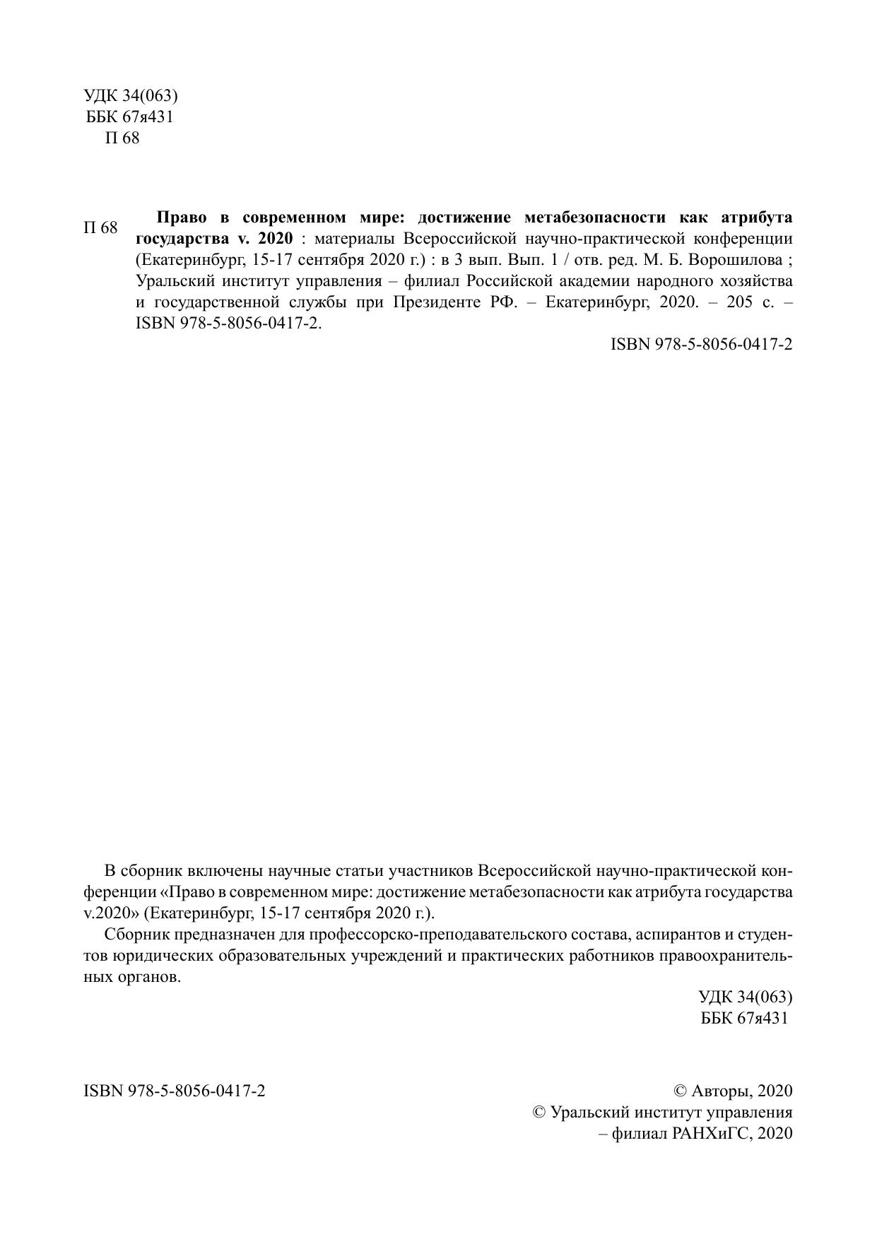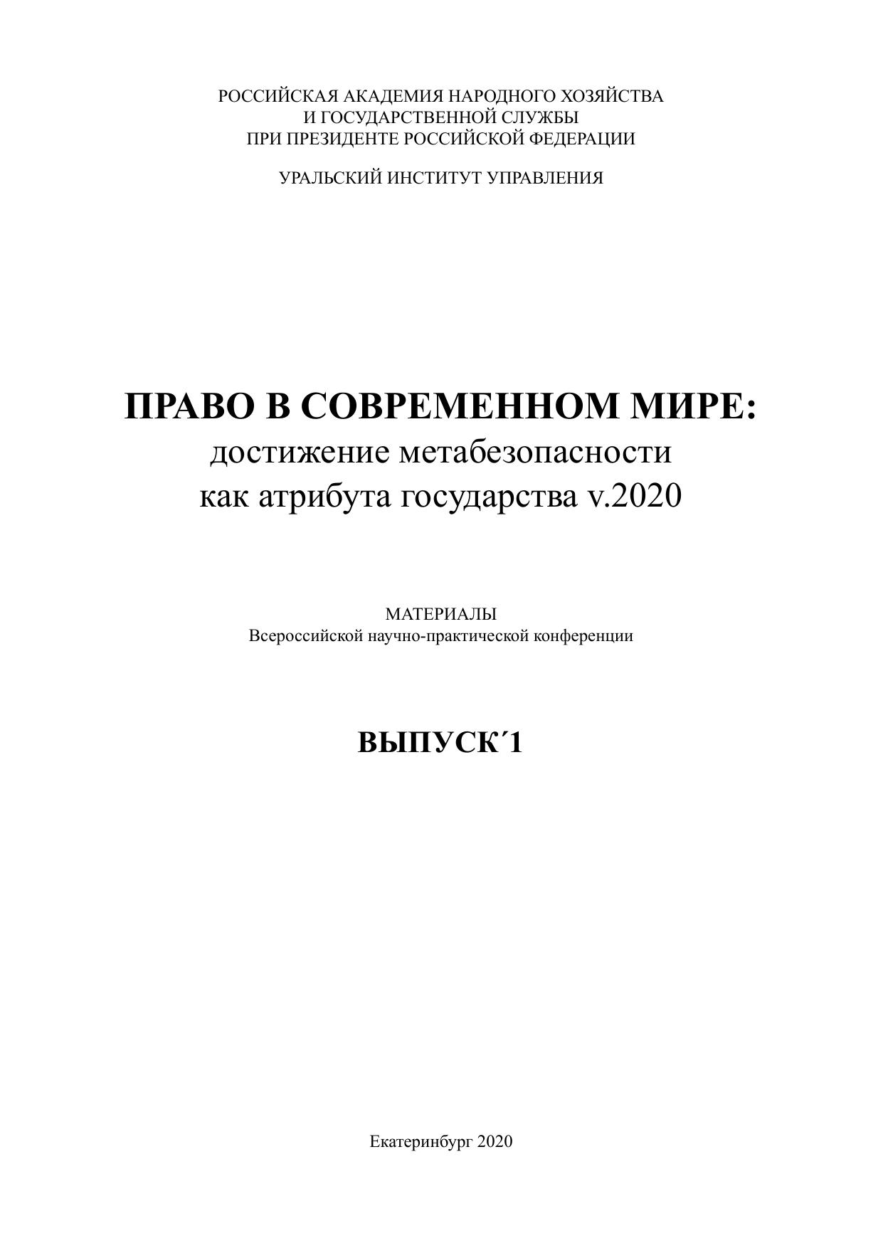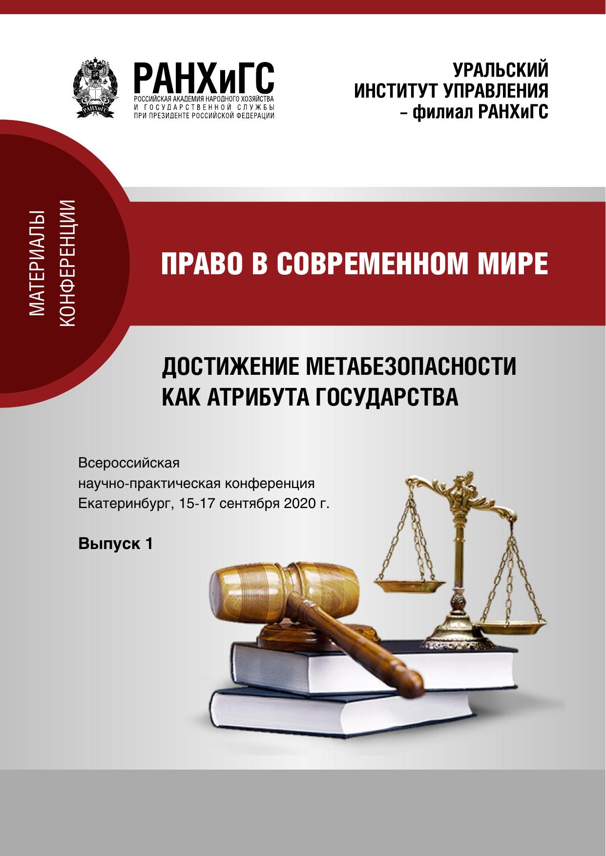 Право в современном мире: достижение метабезопасности как атрибута государства v. 2020: материалы Всероссийской научнопрактической конференции (Екатеринбург, 1517 сентября 2020 г.): в 3 вып. Вып. 1