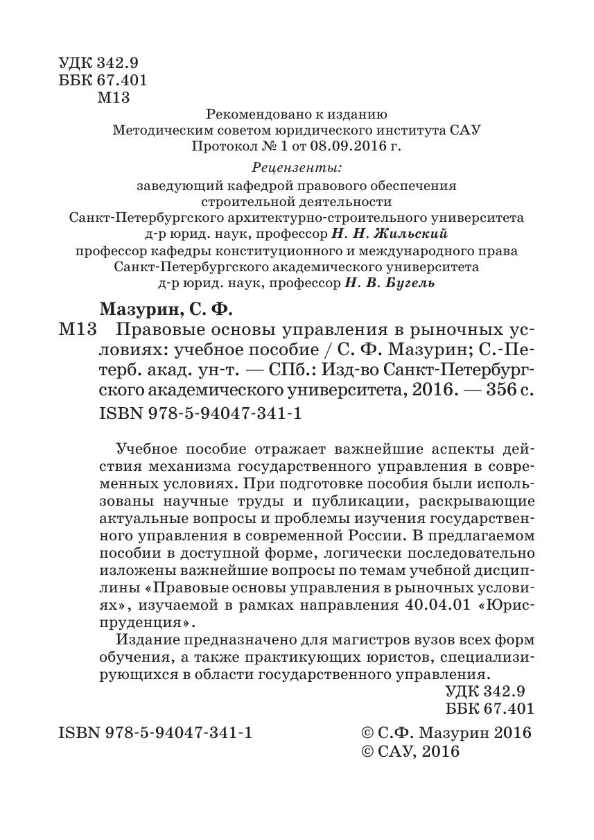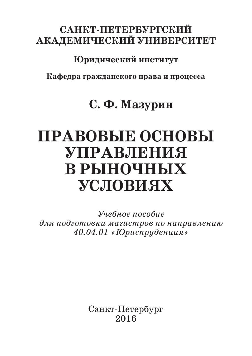 Учебное пособие отражает важнейшие аспекты действия механизма государственного управления в современных условиях. При подготовке пособия были использованы научные труды и публикации, раскрывающие актуальные вопросы и проблемы изучения государственного управления в современной России. В предлагаемом пособии в доступной форме, логически последовательно изложены важнейшие вопросы по темам учебной дисциплины «Правовые основы управления в рыночных условиях», изучаемой в рамках направления 40.04.01 «Юриспруденция». Издание предназначено для магистров вузов всех форм обучения, а также практикующих юристов, специализирующихся в области государственного управления