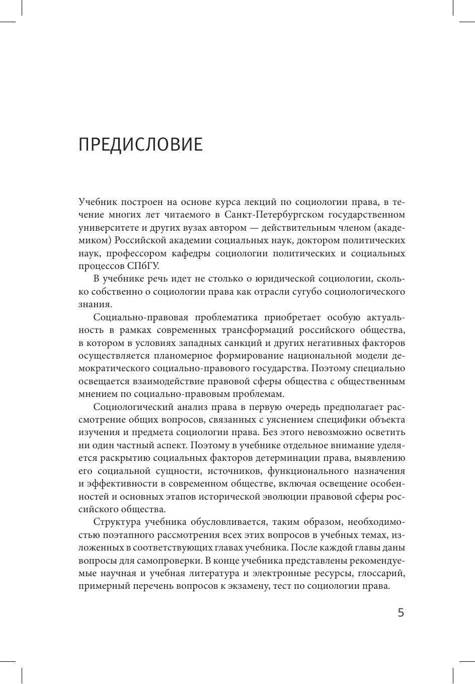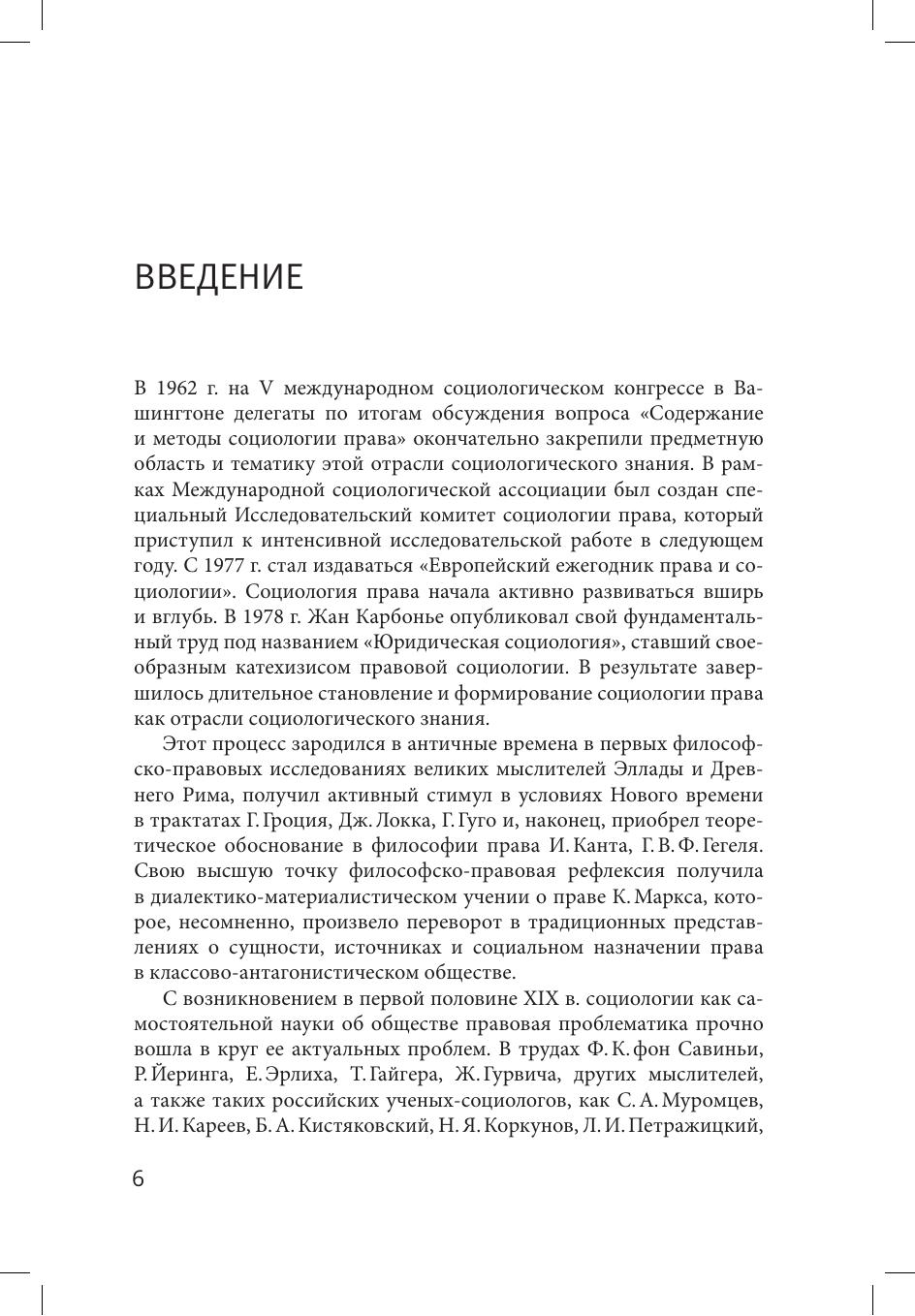 В учебнике рассматриваются объект изучения, предмет, структура и функции социологии права. Выявляются социальные факторы детерминации права, его социальная сущность, источники, функциональное назначение и эффективность в современном обществе. Показаны специфика и структура правовой сферы российского общества, особенности и основные этапы ее исторической эволюции в условиях современных трансформаций общества и формирования национальной модели демократического социально-правового государства. Специально освещается взаимодействие правовой сферы общества с общественным мнением по социально-правовым проблемам. Учебник предназначен для студентов бакалавриата, обучающихся по направлению «Социология», может быть интересен юристам — специалистам в области теории государства и права.