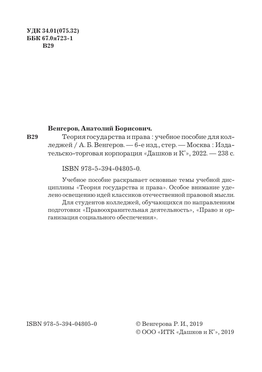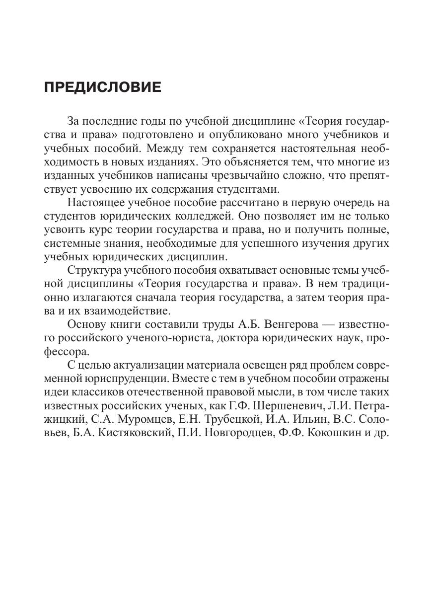 Учебное пособие раскрывает основные темы учебной дисциплины «Теория государства и права». Особое внимание уделено освещению идей классиков отечественной правовой мысли. Для студентов колледжей, обучающихся по направлениям подготовки «Правоохранительная деятельность», «Право и организация социального обеспечения».