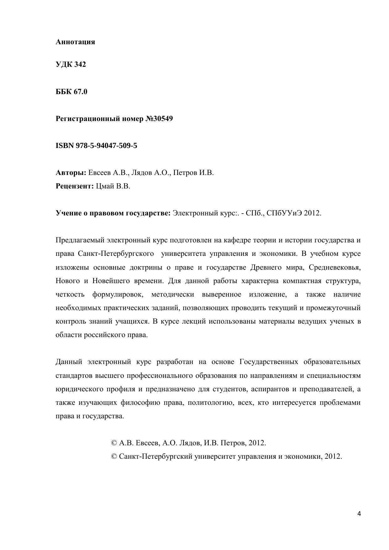 Предлагаемый электронный курс подготовлен на кафедре теории и истории государства и права Санкт-Петербургского университета управления и экономики. В учебном курсе изложены основные доктрины о праве и государстве Древнего мира, Средневековья, Нового и Новейшего времени. Для данной работы характерна компактная структура, четкость формулировок, методически выверенное изложение, а также наличие необходимых практических заданий, позволяющих проводить текущий и промежуточный контроль знаний учащихся. В курсе лекций использованы материалы ведущих ученых в области российского права. Данный электронный курс разработан на основе Государственных образовательных стандартов высшего профессионального образования по направлениям и специальностям юридического профиля и предназначено для студентов, аспирантов и преподавателей, а также изучающих философию права, политологию, всех, кто интересуется проблемами права и государства.