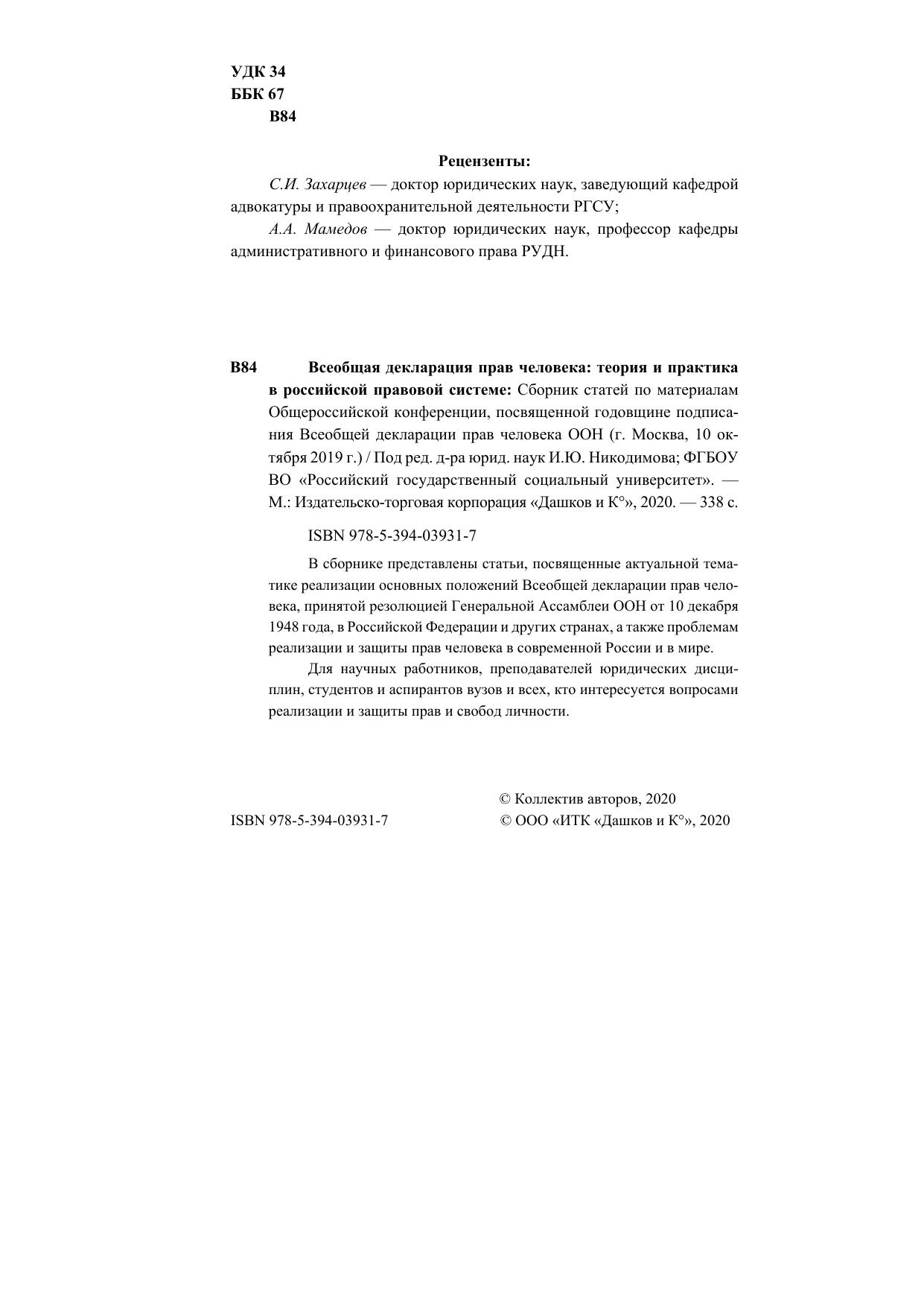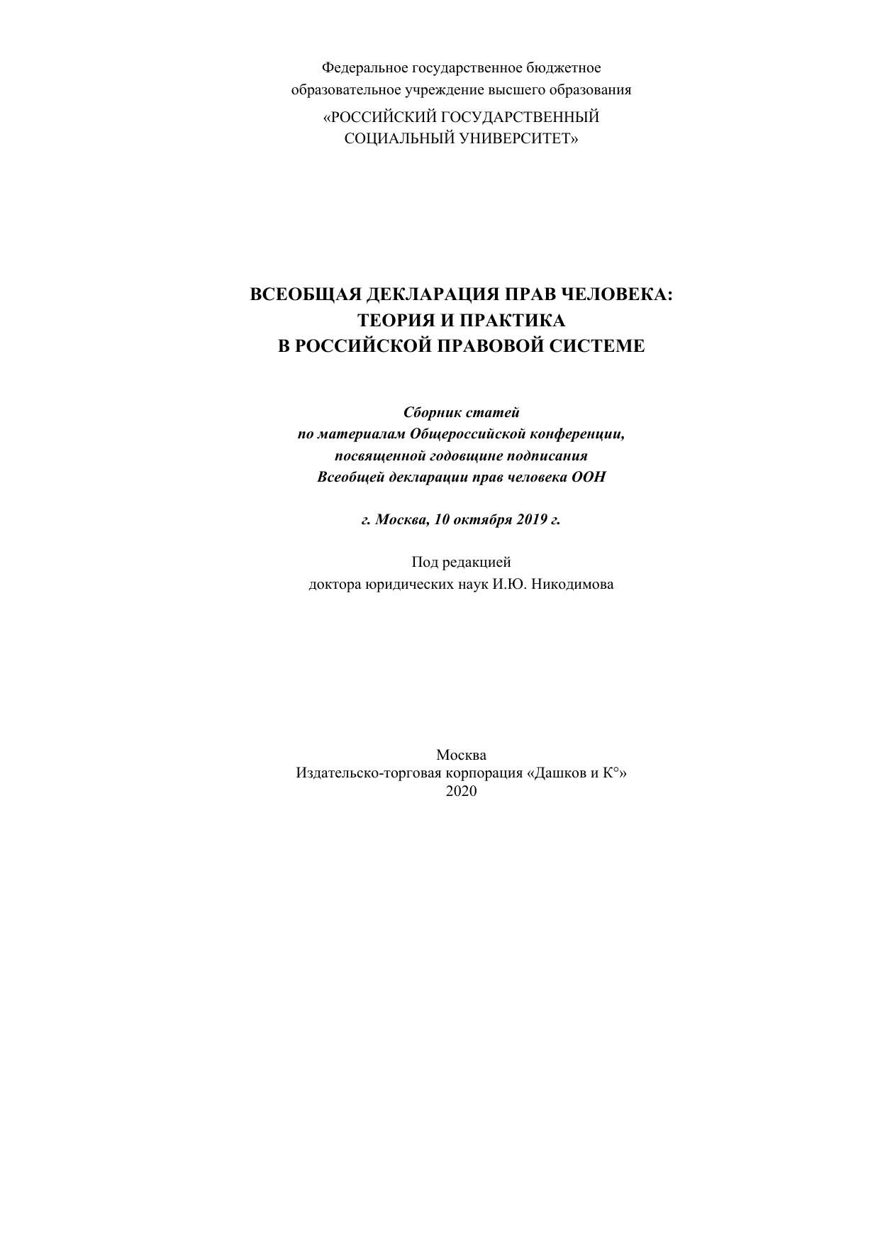 В сборнике представлены статьи, посвященные актуальной тематике реализации основных положений Всеобщей декларации прав человека, принятой резолюцией Генеральной Ассамблеи ООН от 10 декабря 1948 года, в Российской Федерации и других странах, а также проблемам реализации и защиты прав человека в современной России и в мире.Для научных работников, преподавателей юридических дисциплин, студентов и аспирантов вузов и всех, кто интересуется вопросами реализации и защиты прав и свобод личности.