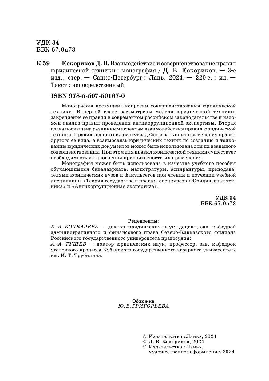 Монография посвящена вопросам совершенствования юридической техники. В первой главе рассмотрены модели юридической техники, закрепление ее правил в современном российском законодательстве и изложен анализ правил проведения антикоррупционной экспертизы. Вторая глава посвящена различным аспектам взаимодействия правил юридической техники. Правила одного вида могут задействовать опыт применения правил другого ее вида, а взаимосвязь юридических техник по созданию и толкованию юридических документов может быть использована для их взаимного совершенствования. При этом для правил юридической техники существует необходимость установления приоритетности их применения. Монография может быть использована в качестве учебного пособия обучающимися бакалавриата, магистратуры, аспирантуры, преподавателями юридических вузов и факультетов при чтении и изучении учебной дисциплины «Теория государства и права», спецкурсов «Юридическая техника» и «Антикоррупционная экспертиза».