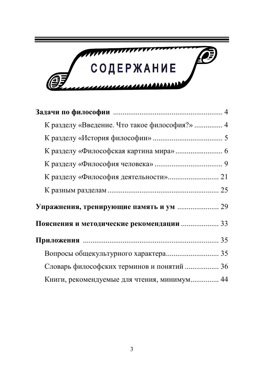 Задачи и упражнения для удобства преподавания распределены (с известной долей условности) по пяти разделам учебного курса («Что такое философия?», «История философии», «Философская картина мира», «Философия человека», «Философия деятельности»). Кроме того, в отдельный раздел помещены задачи и упражнения, которые трудно отнести к какому-то одному разделу учебного курса.
