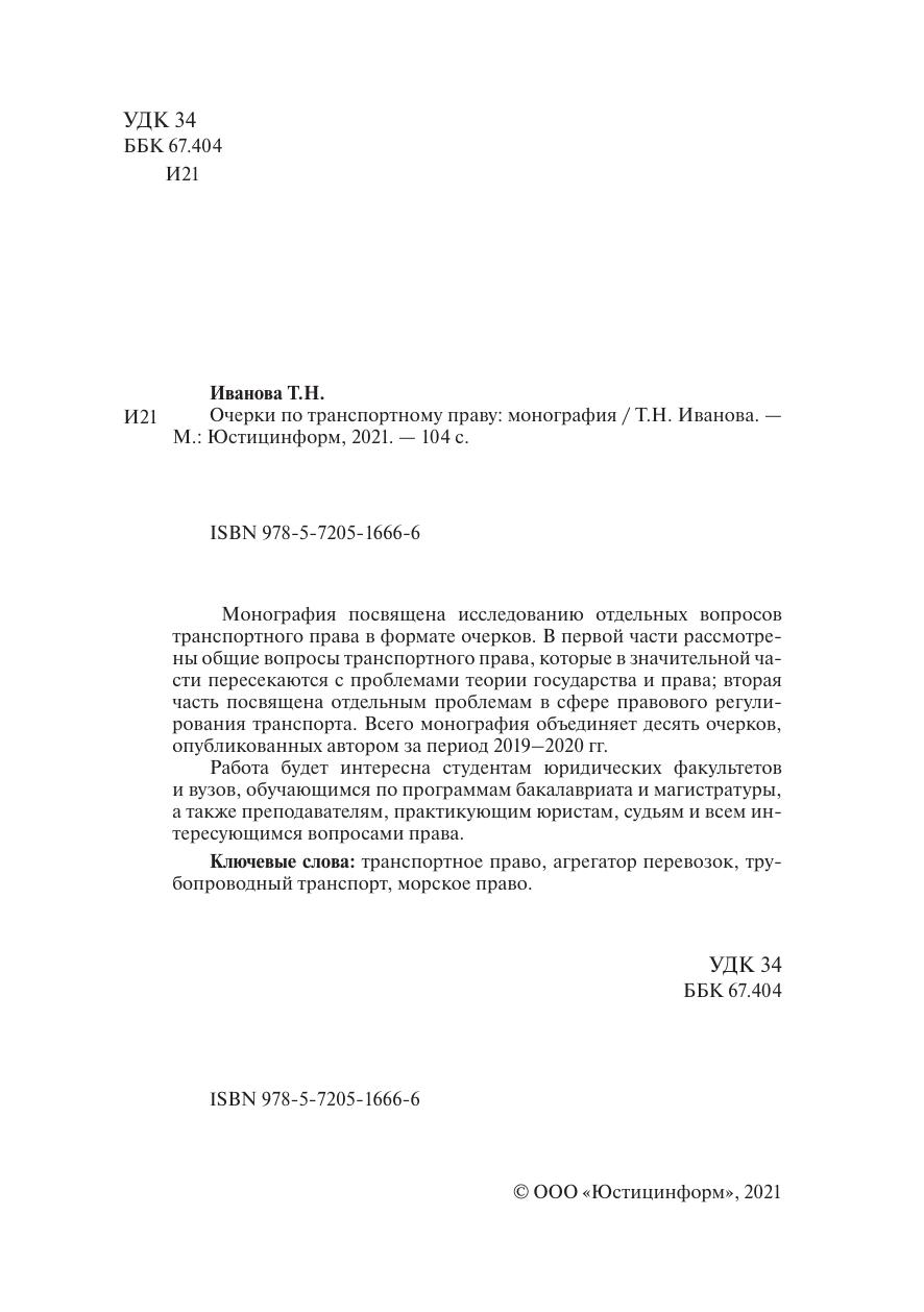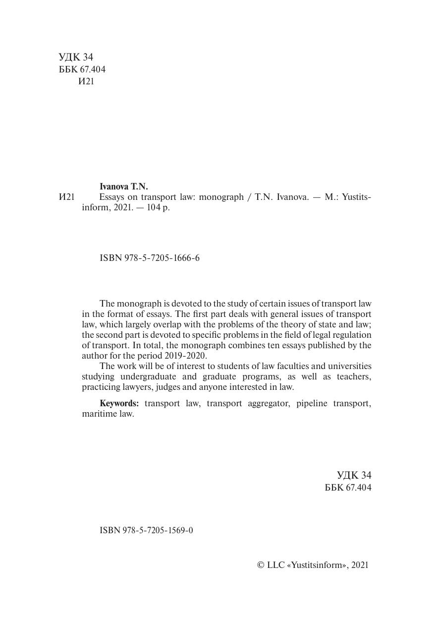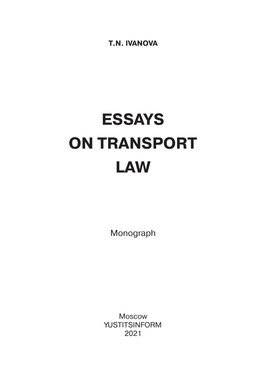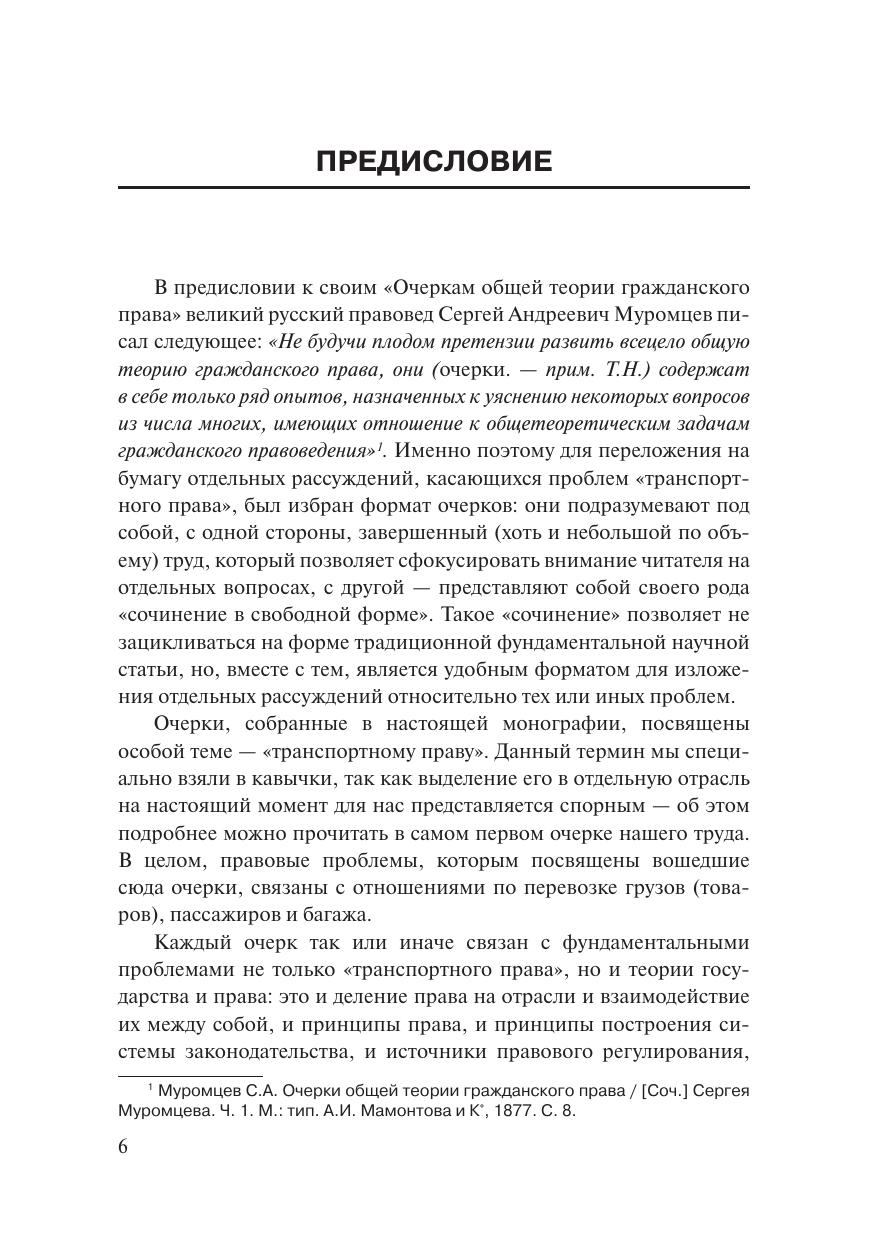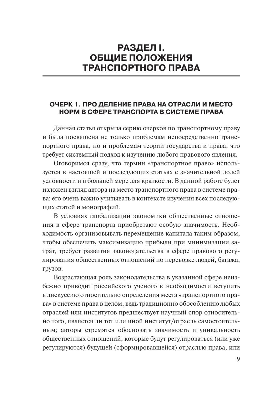 Монография посвящена исследованию отдельных вопросов транспортного права в формате очерков. В первой части рассмотрены общие вопросы транспортного права, которые в значительной части пересекаются с проблемами теории государства и права; вторая часть посвящена отдельным проблемам в сфере правового регулирования транспорта. Всего монография объединяет десять очерков, опубликованных автором за период 2019–2020 гг. Работа будет интересна студентам юридических факультетов и вузов, обучающимся по программам бакалавриата и магистратуры, а также преподавателям, практикующим юристам, судьям и всем интересующимся вопросами права.