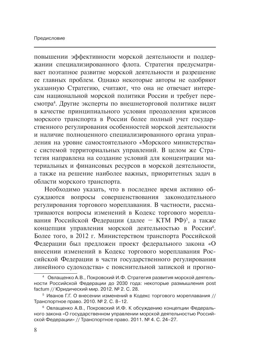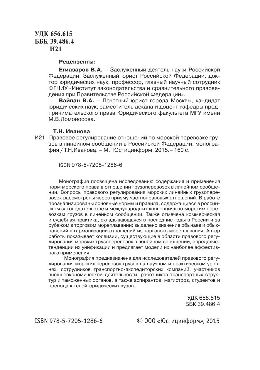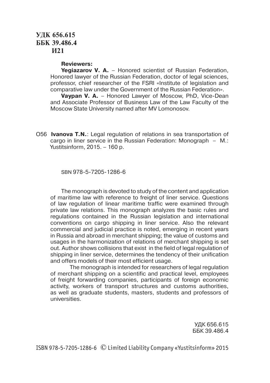 Монография посвящена исследованию содержания и применения норм морского права в отношении грузоперевозок в линейном сообщении. Вопросы правового регулирования морских линейных грузоперевозок рассмотрены через призму частноправовых отношений. В работе проанализированы основные нормы и правила, содержащиеся в российском законодательстве и международных конвенциях по морским перевозкам грузов в линейном сообщении. Также отмечена коммерческая и судебная практика, складывающаяся в последние годы в России и за рубежом в торговом мореплавании; выделено значение обычаев и обыкновений в гармонизации отношений из торгового мореплавания. Автор работы показывает коллизии, существующие в области правового регулирования морских грузоперевозок в линейном сообщении, определяет тенденции их унификации и предлагает модели их наиболее эффективного применения. Монография предназначена для исследователей правового регулирования морских перевозок грузов на научном и практическом уровнях, сотрудников транспортно-экспедиторских компаний, участников внешнеэкономической деятельности, работников транспортных структур и таможенных органов, а также аспирантов, магистров, студентов и преподавателей юридических вузов.