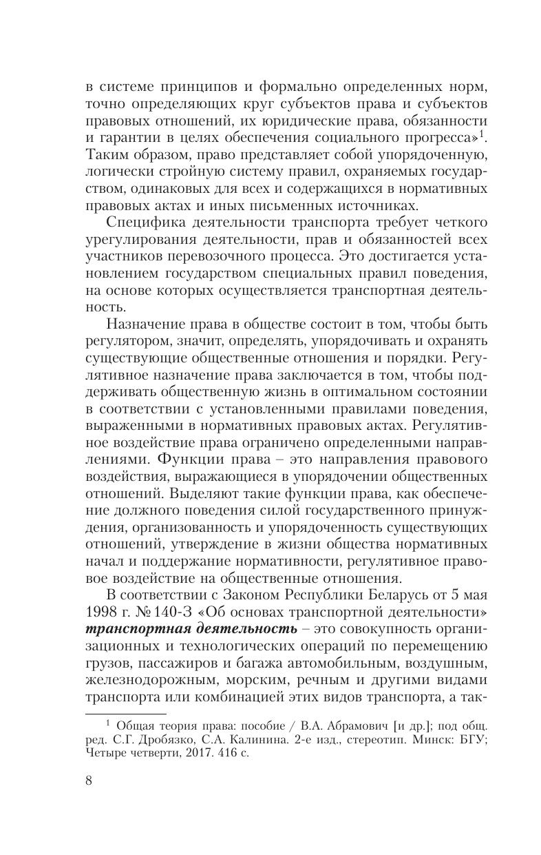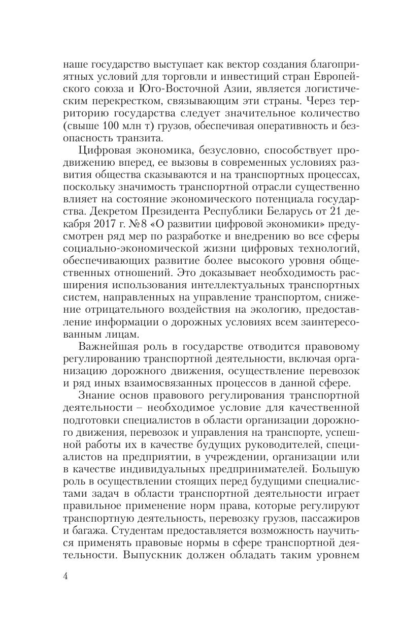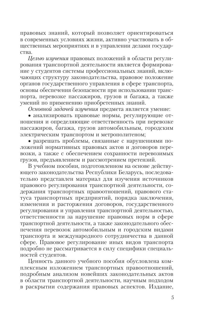Представлен материал для изучения источников правового регулирования транспортной деятельности, содержания транспортных правоотношений, договорных отношений в транспортной сфере, государственного регулирования и управления транспортной деятельностью, ответственности за нарушение законодательства при осуществлении транспортной деятельности, международного сотрудничества в транспортной сфере. Для студентов учреждений высшего образования по специальностям «Организация перевозок и управление на автомобильном и городском транспорте», «Организация дорожного движения», «Эксплуатация интеллектуальных транспортных систем на автомобильном и городском транспорте». Может быть полезно преподавателям, работникам правоприменительных органов, всем, кто интересуется вопросами правового регулирования транспортной деятельности.