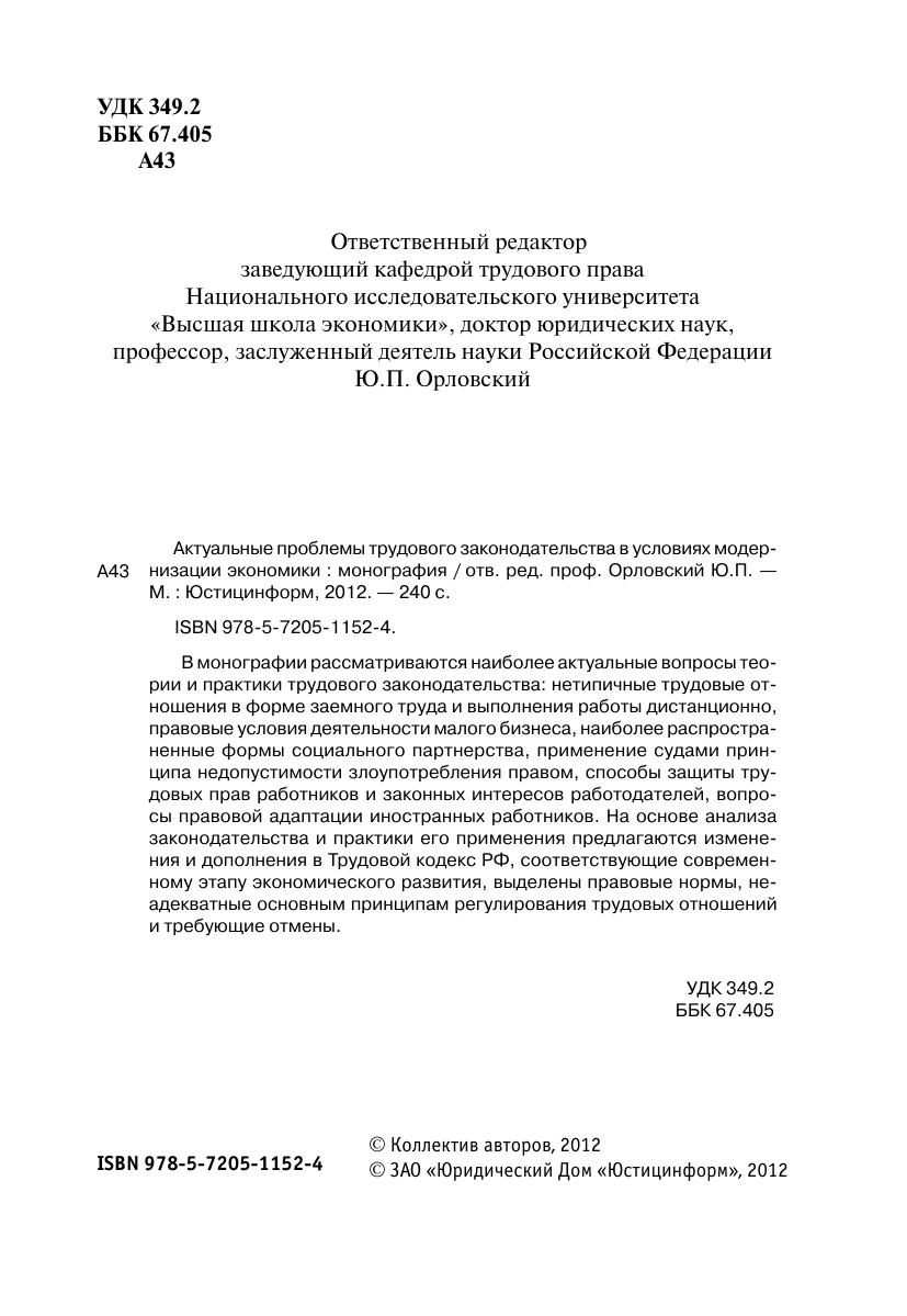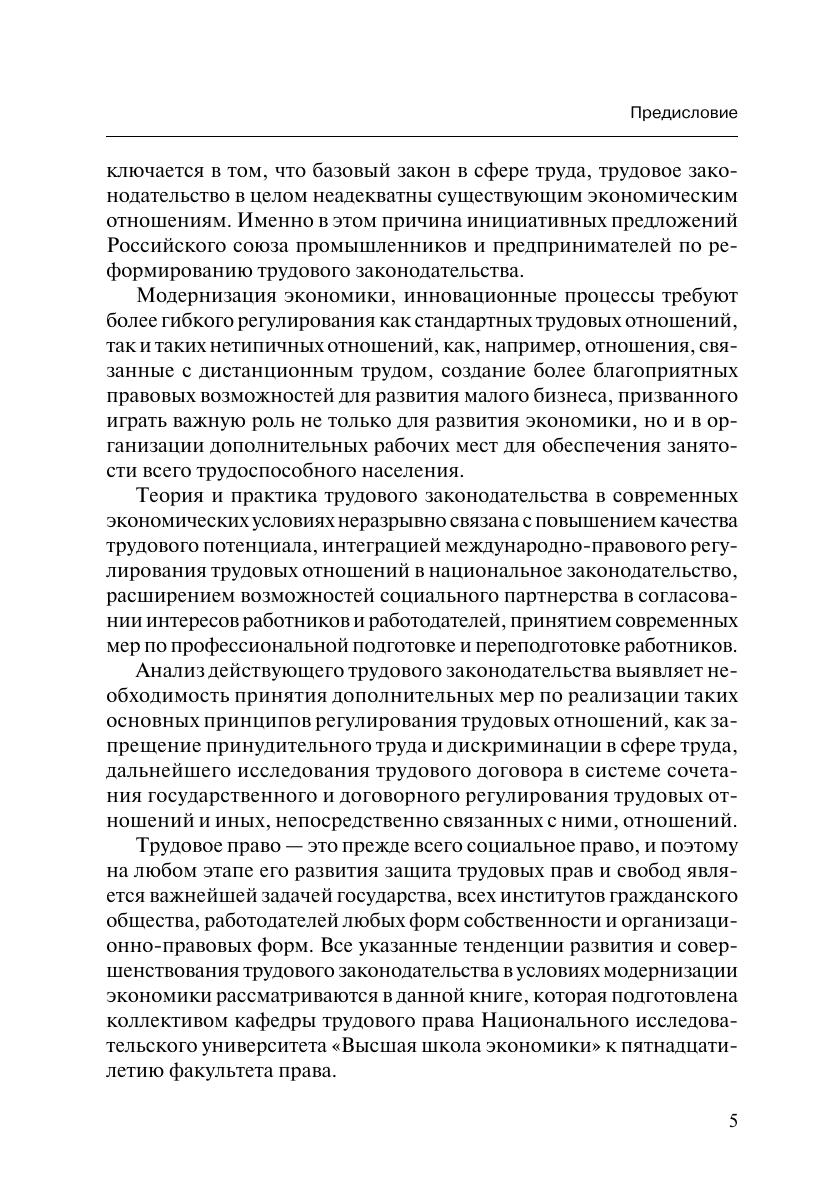 В монографии рассматриваются наиболее актуальные вопросы теории и практики трудового законодательства: нетипичные трудовые отношения в форме заемного труда и выполнения работы дистанционно, правовые условия деятельности малого бизнеса, наиболее распространенные формы социального партнерства, применение судами принципа недопустимости злоупотребления правом, способы защиты трудовых прав работников и законных интересов работодателей, вопросы правовой адаптации иностранных работников. На основе анализа законодательства и практики его применения предлагаются изменения и дополнения в Трудовой кодекс РФ, соответствующие современному этапу экономического развития, выделены правовые нормы, неадекватные основным принципам регулирования трудовых отношений и требующие отмены.