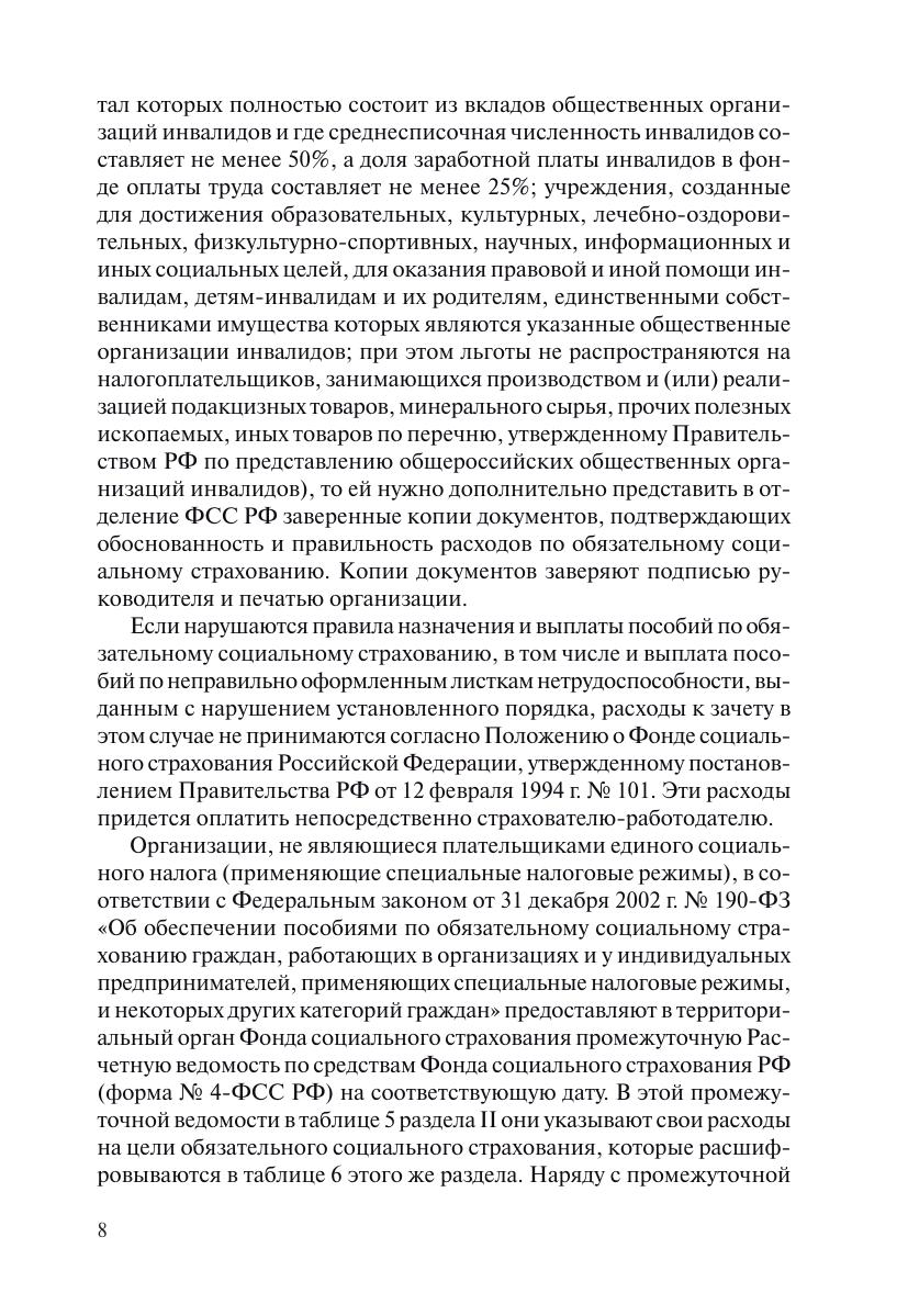 Удобное практическое пособие по расчету выплат, производящихся на основании листков нетрудоспособности и прочих страховых выплат.Автор на наглядных примерах показывает алгоритмы исчисления размеров пособий по временной нетрудоспособности по причине заболевания, ухода за больным ребенком, беременности и родов, несчастного случая на производстве, пособия по уходу за ребенком до полутора лет и др. Уделяется внимание вопросам определения страхового и непрерывного трудового стажа, подсчета среднего заработка. В книге приводятся также примеры заполнения больничного листа, ведомости по расчетам с Фондом социального страхования РФ.Издание заинтересует работников кадровых служб, бухгалтеров и экономистов предприятий общей и упрощенной системы налогообложения, производящих обязательные и добровольные платежи в ФСС РФ, сотрудников Фонда социального страхования. Каждому читателю книга поможет узнать о его правах на гарантии от государства в случае наступления нетрудоспособности.