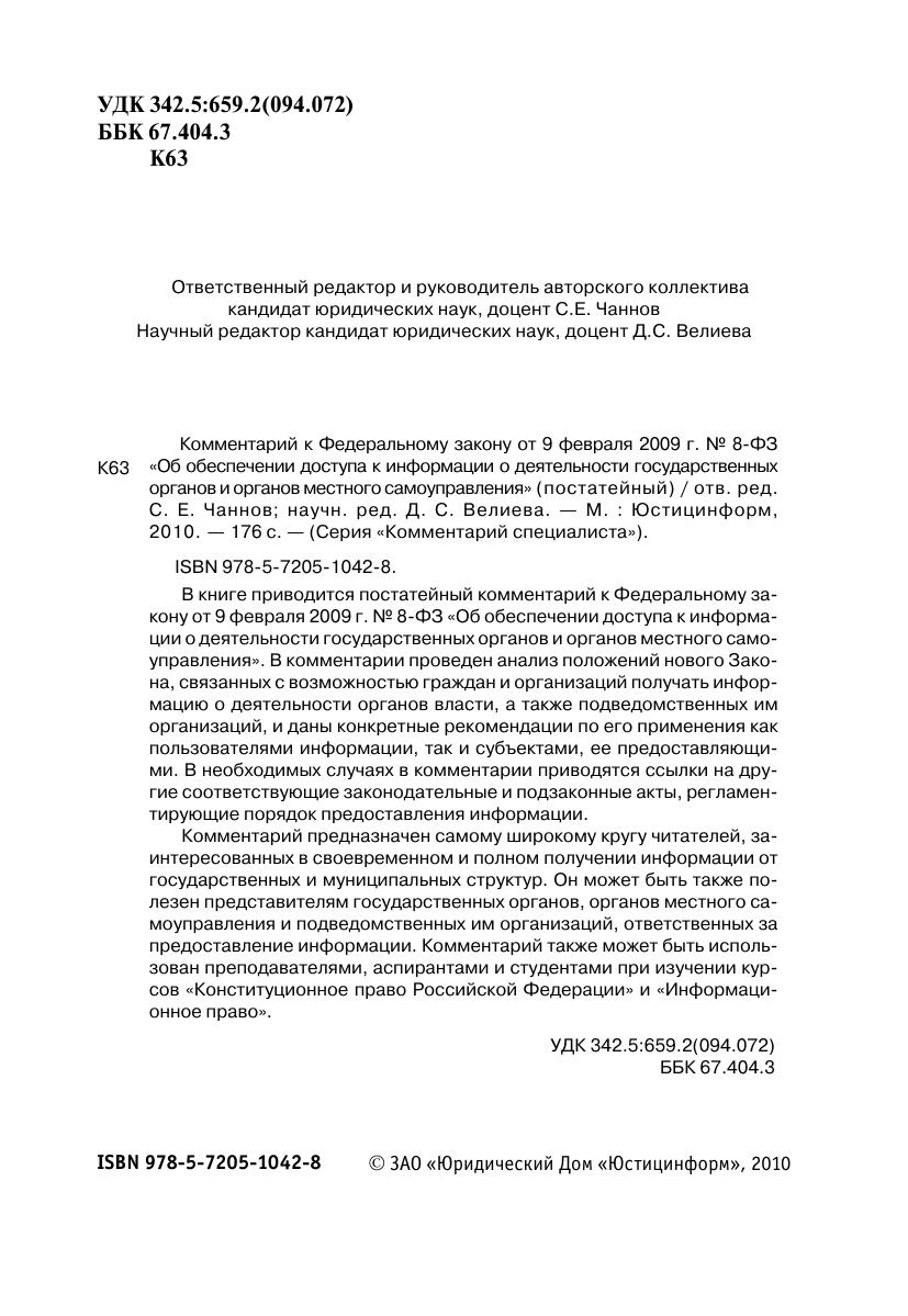 В книге приводится постатейный комментарий к Федеральному закону от 9 февраля 2009 г. № 8-ФЗ «Об обеспечении доступа к информации о деятельности государственных органов и органов местного самоуправления». В комментарии проведен анализ положений нового Закона, связанных с возможностью граждан и организаций получать информацию о деятельности органов власти, а также подведомственных им организаций, и даны конкретные рекомендации по его применения как пользователями информации, так и субъектами, ее предоставляющими. В необходимых случаях в комментарии приводятся ссылки на другие соответствующие законодательные и подзаконные акты, регламентирующие порядок предоставления информации.