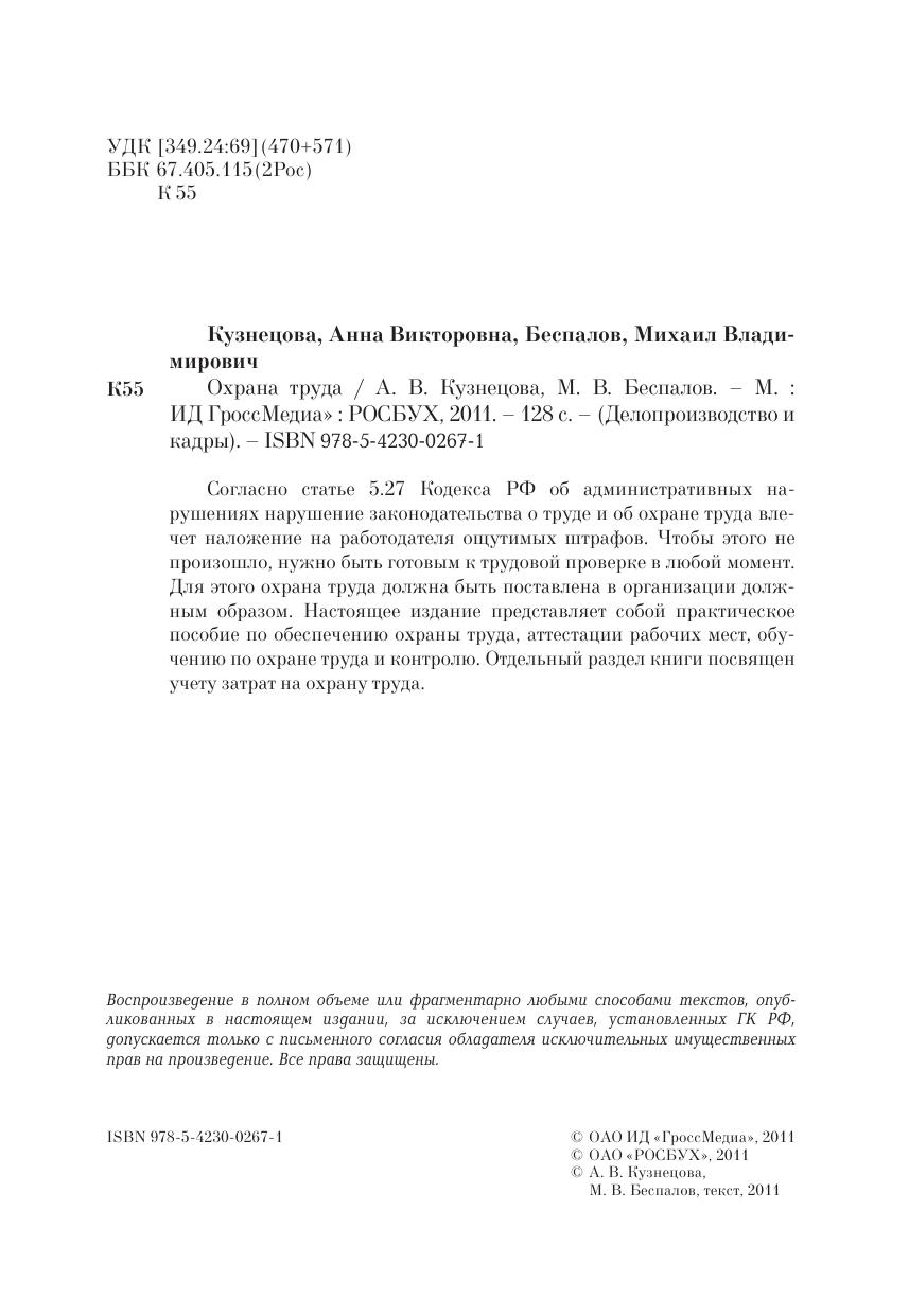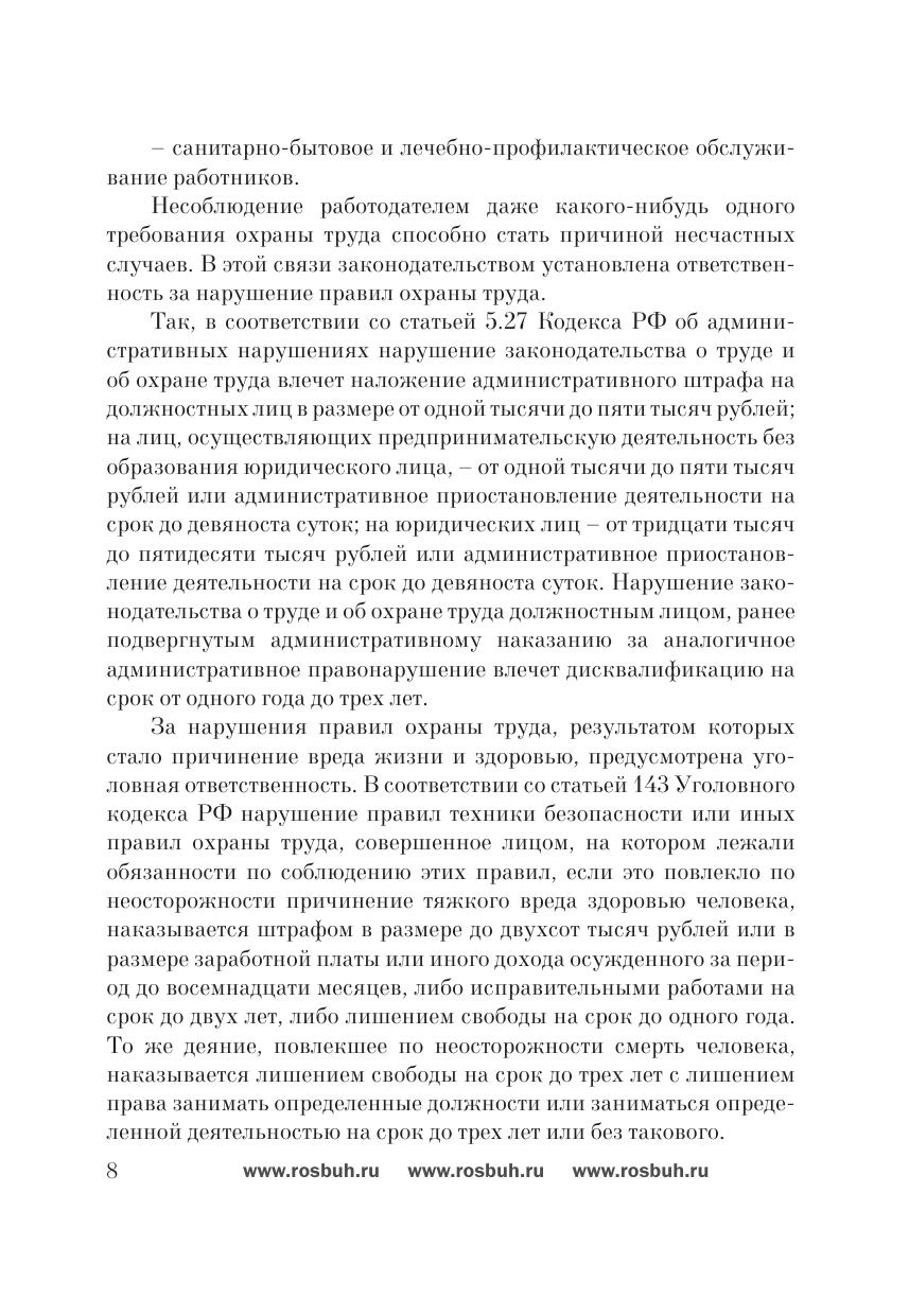 Согласно статье 5.27 Кодекса РФ об административных нарушениях нарушение законодательства о труде и об охране труда влечет наложение на работодателя ощутимых штрафов. Чтобы этого не произошло, нужно быть готовым к трудовой проверке в любой момент. Для этого охрана труда должна быть поставлена в организации должным образом. Настоящее издание представляет собой практическое пособие по обеспечению охраны труда, аттестации рабочих мест, обучению по охране труда и контролю. Отдельный раздел книги посвящен учету затрат на охрану труда.