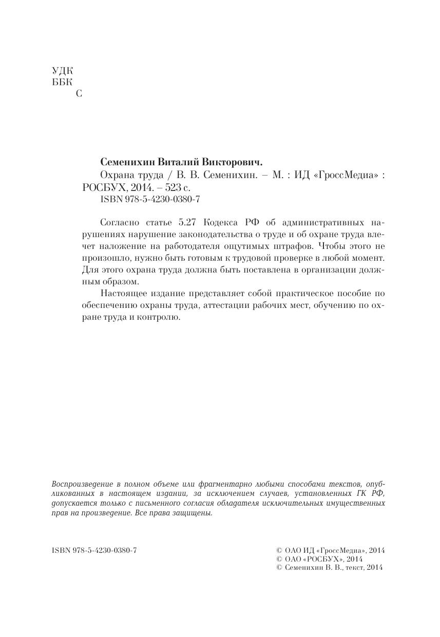 Согласно статье 5.27 Кодекса РФ об административных нарушениях нарушение законодательства о труде и об охране труда влечет наложение на работодателя ощутимых штрафов. Чтобы этого не произошло, нужно быть готовым к трудовой проверке в любой момент. Для этого охрана труда должна быть поставлена в организации должным образом. Настоящее издание представляет собой практическое пособие по обеспечению охраны труда, аттестации рабочих мест, обучению по охране труда и контролю.