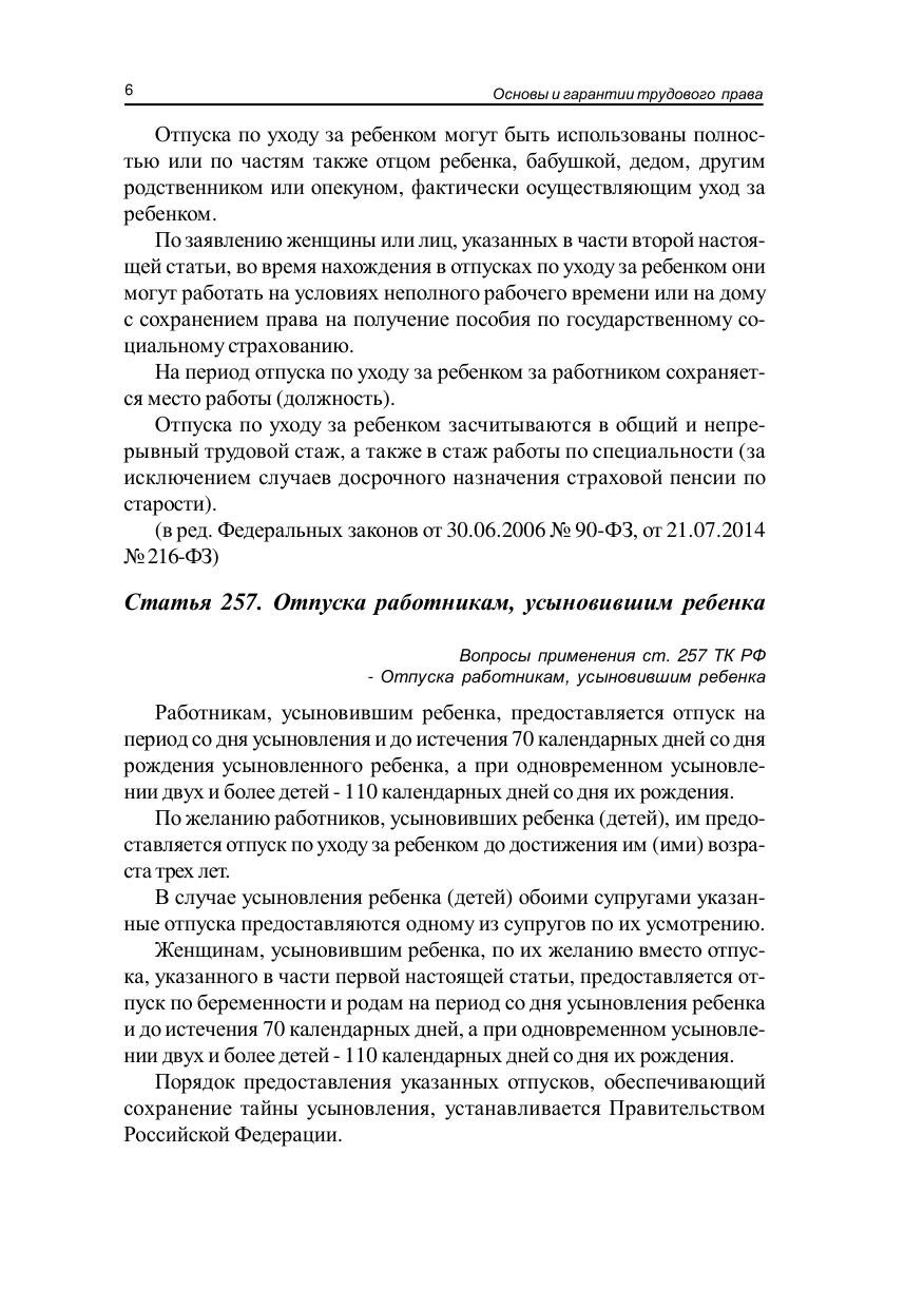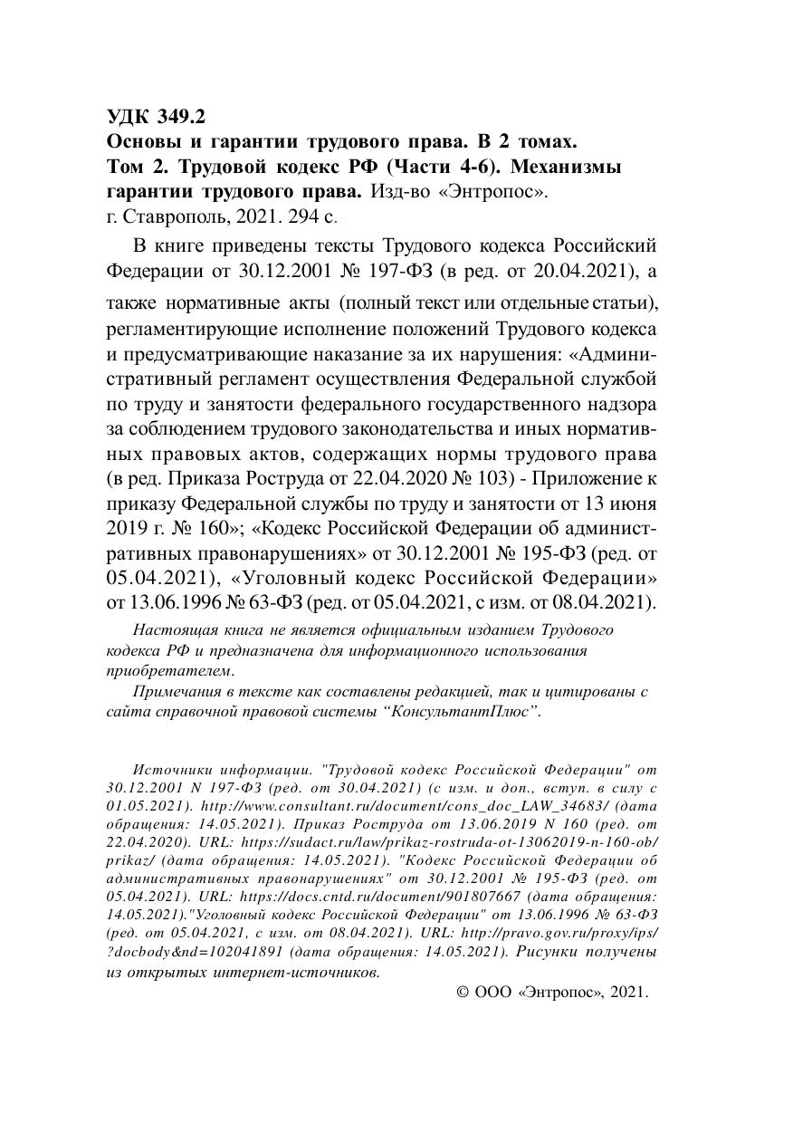 В книге приведены тексты Трудового кодекса Российский Федерации от 30.12.2001 № 197-ФЗ (в ред. от 20.04.2021), а также нормативные акты (полный текст или отдельные статьи), регламентирующие исполнение положений Трудового кодекса и предусматривающие наказание за их нарушения: «Административный регламент осуществления Федеральной службой по труду и занятости федерального государственного надзора за соблюдением трудового законодательства и иных нормативных правовых актов, содержащих нормы трудового права (в ред. Приказа Роструда от 22.04.2020 № 103) - Приложение к приказу Федеральной службы по труду и занятости от 13 июня 2019 г. № 160»; «Кодекс Российской Федерации об административных правонарушениях» от 30.12.2001 № 195-ФЗ (ред. от 05.04.2021), «Уголовный кодекс Российской Федерации» от 13.06.1996 № 63-ФЗ (ред. от 05.04.2021, с изм. от 08.04.2021).