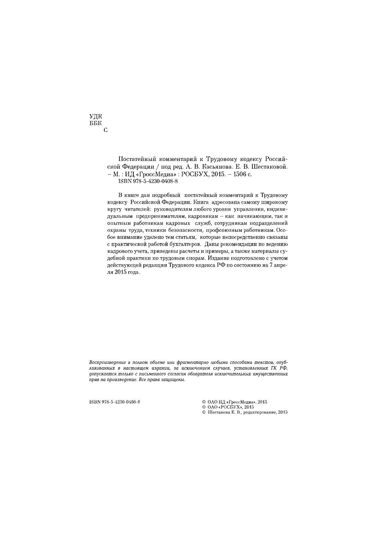 В книге дан подробный постатейный комментарий к Трудовому кодексу Российской Федерации. Книга адресована самому широкому кругу читателей: руководителям любого уровня управления, индивидуальным предпринимателям, кадровикам – как начинающим, так и опытным работникам кадровых служб, сотрудникам подразделений охраны труда, техники безопасности, профсоюзным работникам. Особое внимание уделено тем статьям, которые непосредственно связаны с практической работой бухгалтеров. Даны рекомендации по ведению кадрового учета, приведены расчеты и примеры, а также материалы судебной практики по трудовым спорам. Издание подготовлено с учетом действующей редакции Трудового кодекса РФ по состоянию на 7 апреля 2015 года.