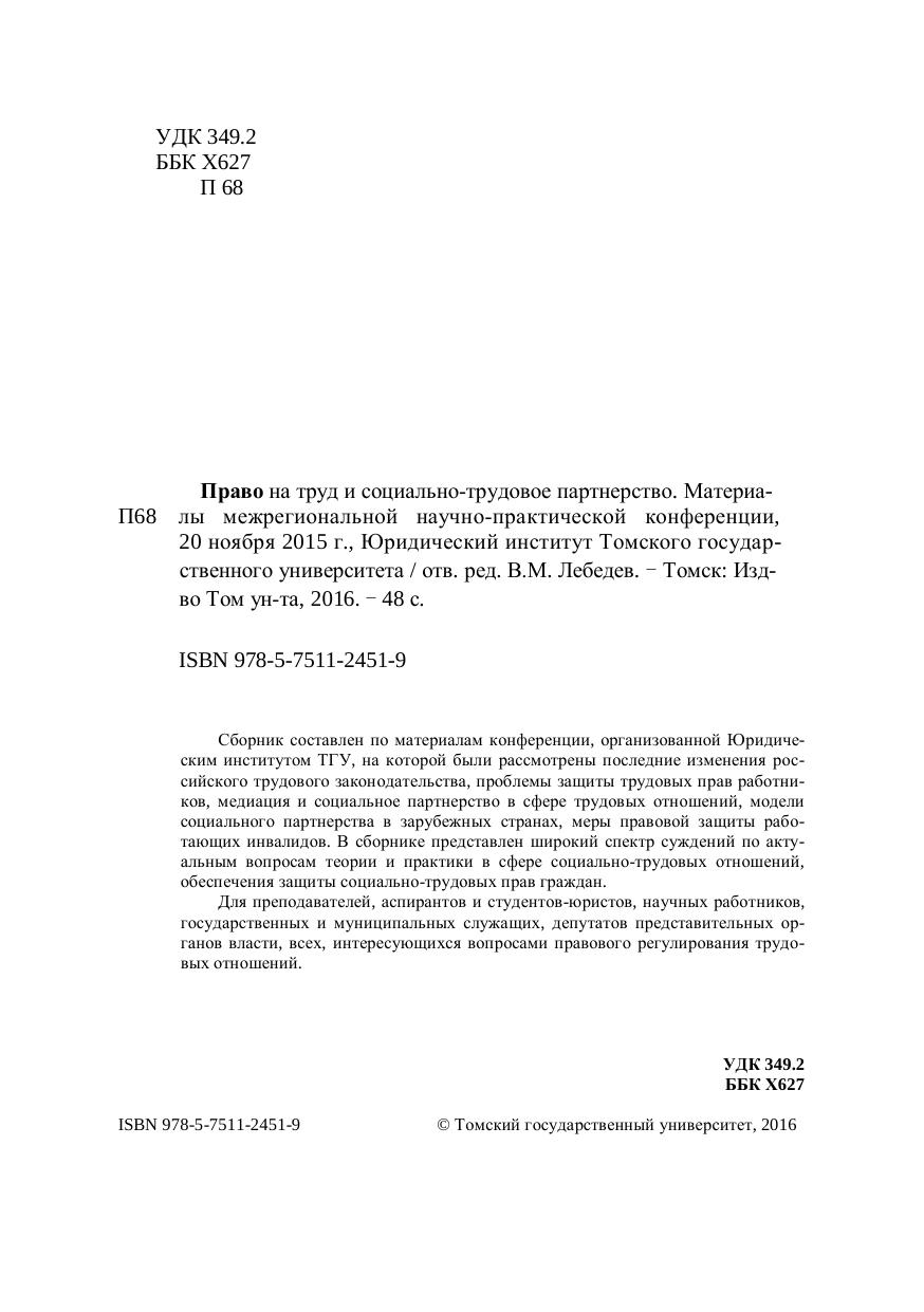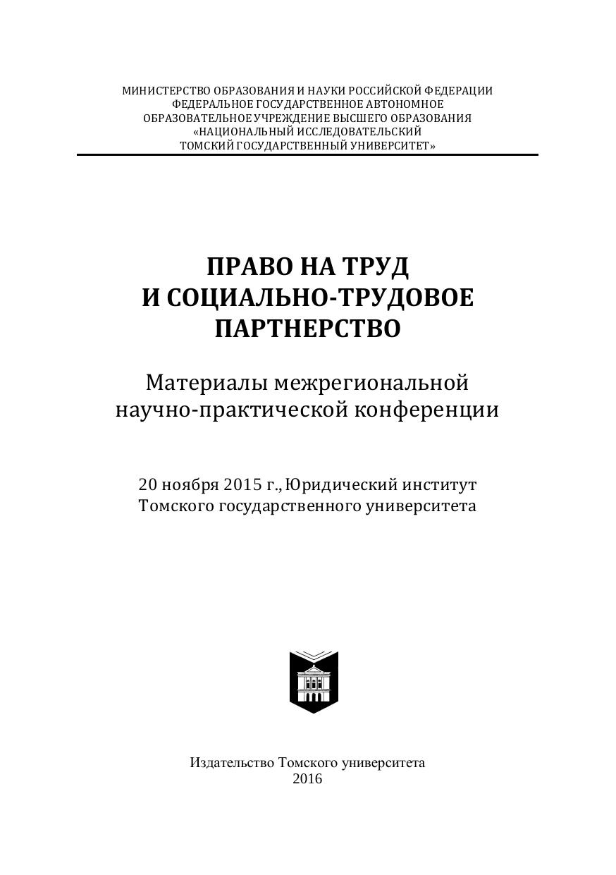 Сборник составлен по материалам конференции, организованной Юридическим институтом ТГУ, на которой были рассмотрены последние изменения российского трудового законодательства, проблемы защиты трудовых прав работников, медиация и социальное партнерство в сфере трудовых отношений, модели социального партнерства в зарубежных странах, меры правовой защиты работающих инвалидов. В сборнике представлен широкий спектр суждений по актуальным вопросам теории и практики в сфете социально-трудовых отношений, обеспечения защиты социально-трудовых прав граждан. Для преподавателей, аспирантов и студентов-юристов, научных работников, государственных и муниципальных служащих, депутатов представительных органов власти, всех интересующихся вопросами правового регулирования трудовых отношений.