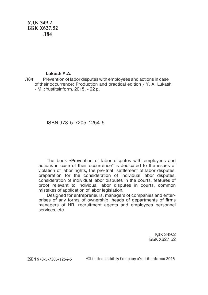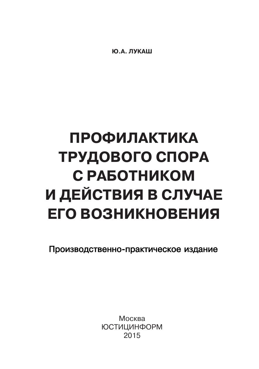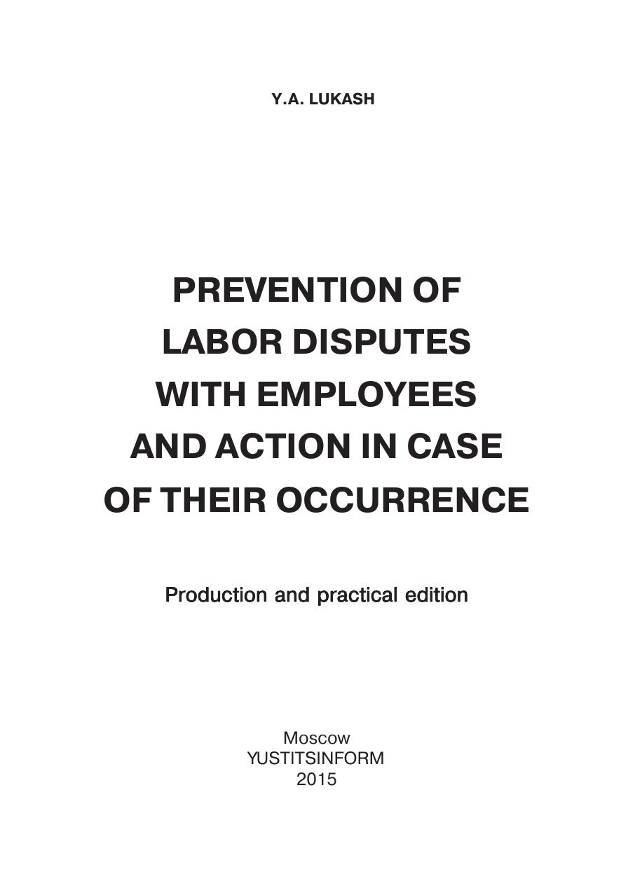 Книга «Профилактика трудового спора с работником и действия в случае его возникновения» посвящена вопросам нарушения трудовых прав работников, досудебного рассмотрения трудовых споров, подготовки к рассмотрению индивидуальных трудовых споров, рассмотрения индивидуальных трудовых споров в судах, связанных с индивидуальными трудовыми спорами особенностей, доказывания в суде своей правоты по трудовым спорам, типичных ошибок применения трудового законодательства. Книга рассчитана на предпринимателей, руководителей фирм и предприятий любых форм собственности, руководителей структурных подразделений фирм, менеджеров по работе с персоналом, агентов по подбору кадров и сотрудников кадровых служб и т.д.