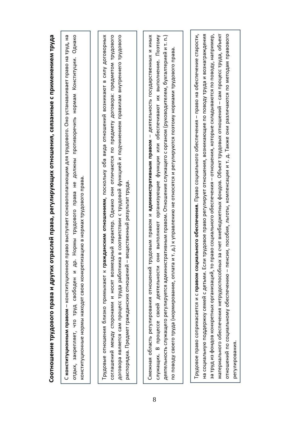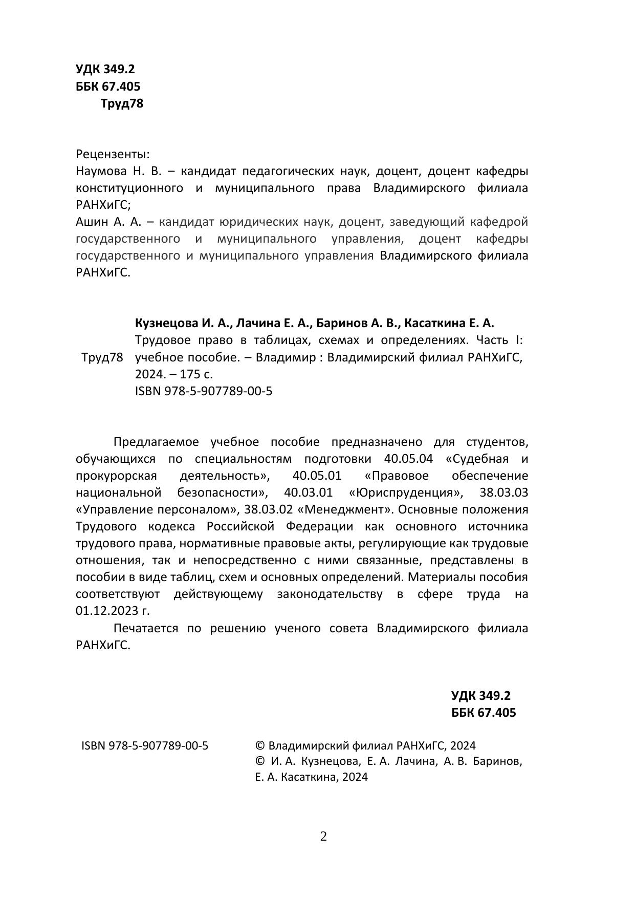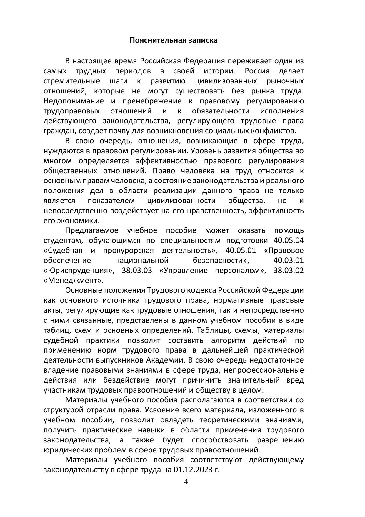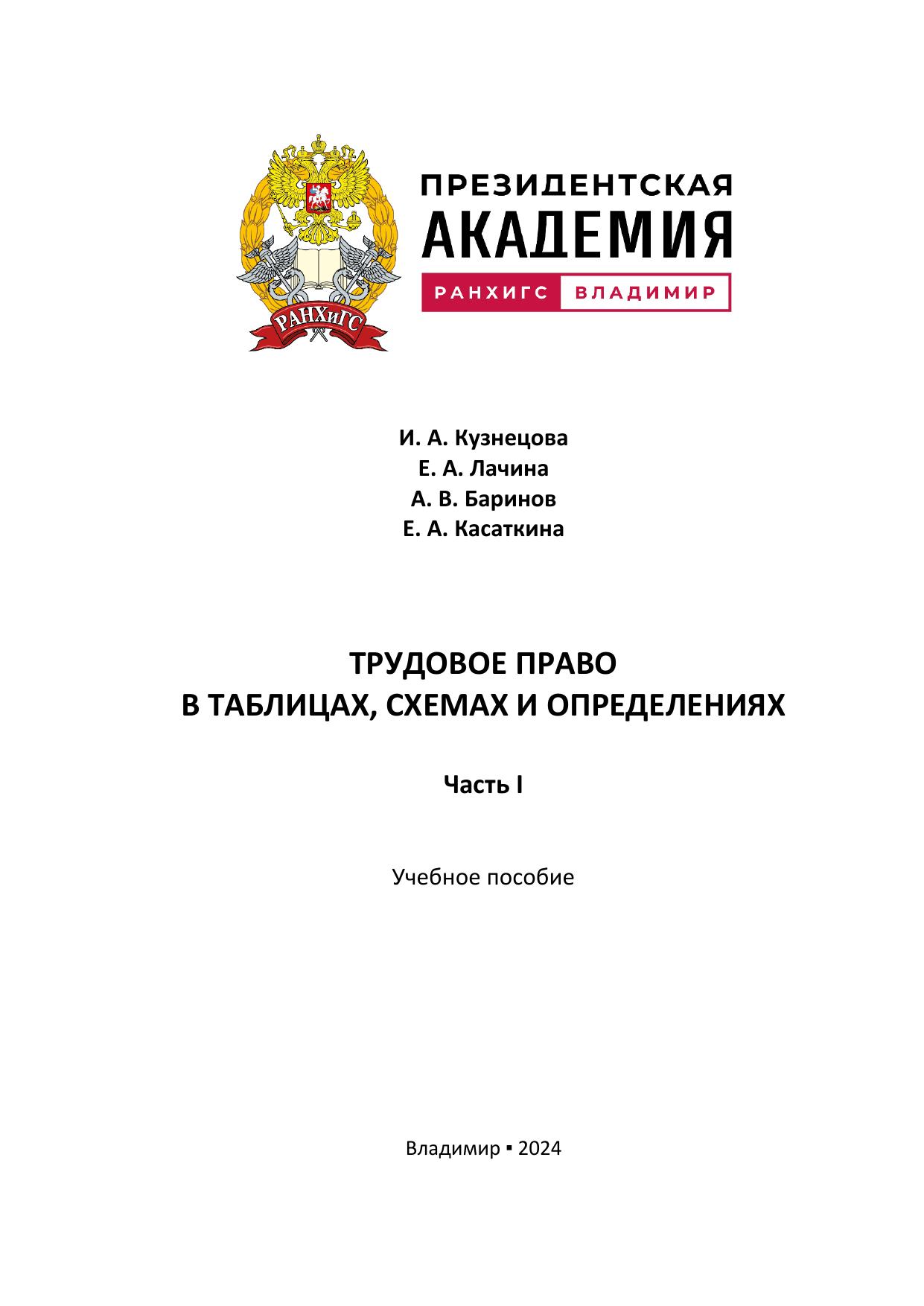 Предлагаемое учебное пособие предназначено для студентов, обучающихся по специальностям подготовки 40.05.04 «Судебная и прокурорская деятельность», 40.05.01 «Правовое обеспечение национальной безопасности», 40.03.01 «Юриспруденция», 38.03.03 «Управление персоналом», 38.03.02 «Менеджмент». Основные положения Трудового кодекса Российской Федерации как основного источника трудового права, нормативные правовые акты, регулирующие как трудовые отношения, так и непосредственно с ними связанные, представлены в пособии в виде таблиц, схем и основных определений. Материалы пособия соответствуют действующему законодательству в сфере труда на 01.12.2023 г. Печатается по решению ученого совета Владимирского филиала РАНХиГС.