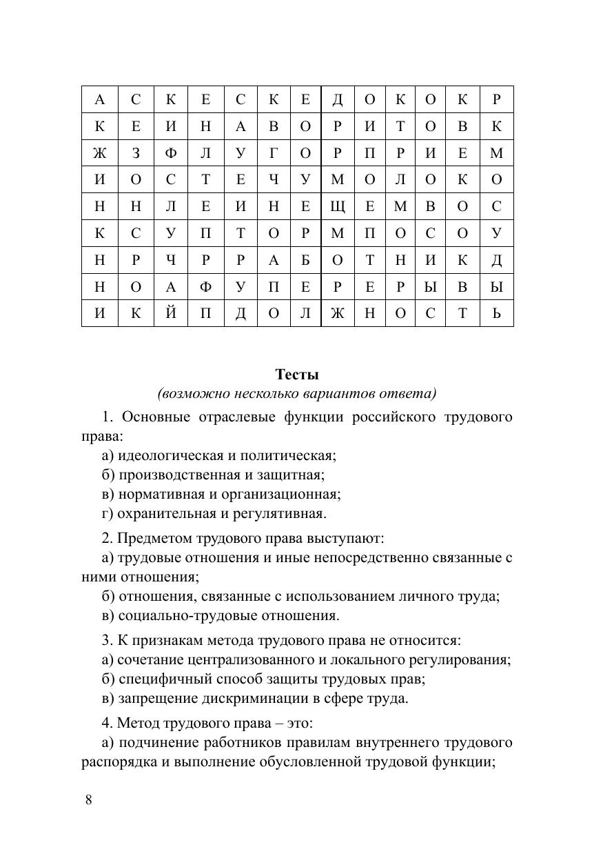 Учебно-методическое пособие составлено с учетом квалификационных требований федеральных образовательных стандартов и включает темы семинарских занятий, вопросы для обсуждения, практические задачи и задания, тесты, темы сообщений и рефератов, примерные вопросы к экзамену (зачету), библиографические списки. Для студентов направлений подготовки 40.03.01 «Юриспруденция», 38.03.04 «Государственное и муниципальное управление», 38.03.02 «Менеджмент»; специальности 40.05.01 «Правовое обеспечение национальной безопасности», а также других направлений подготовки и специальностей, изучающих курс трудового права.