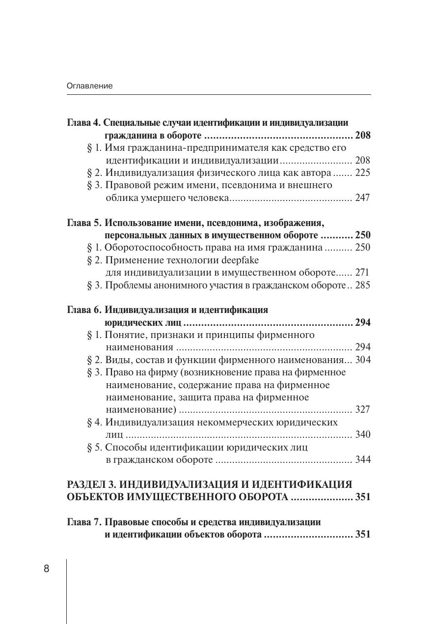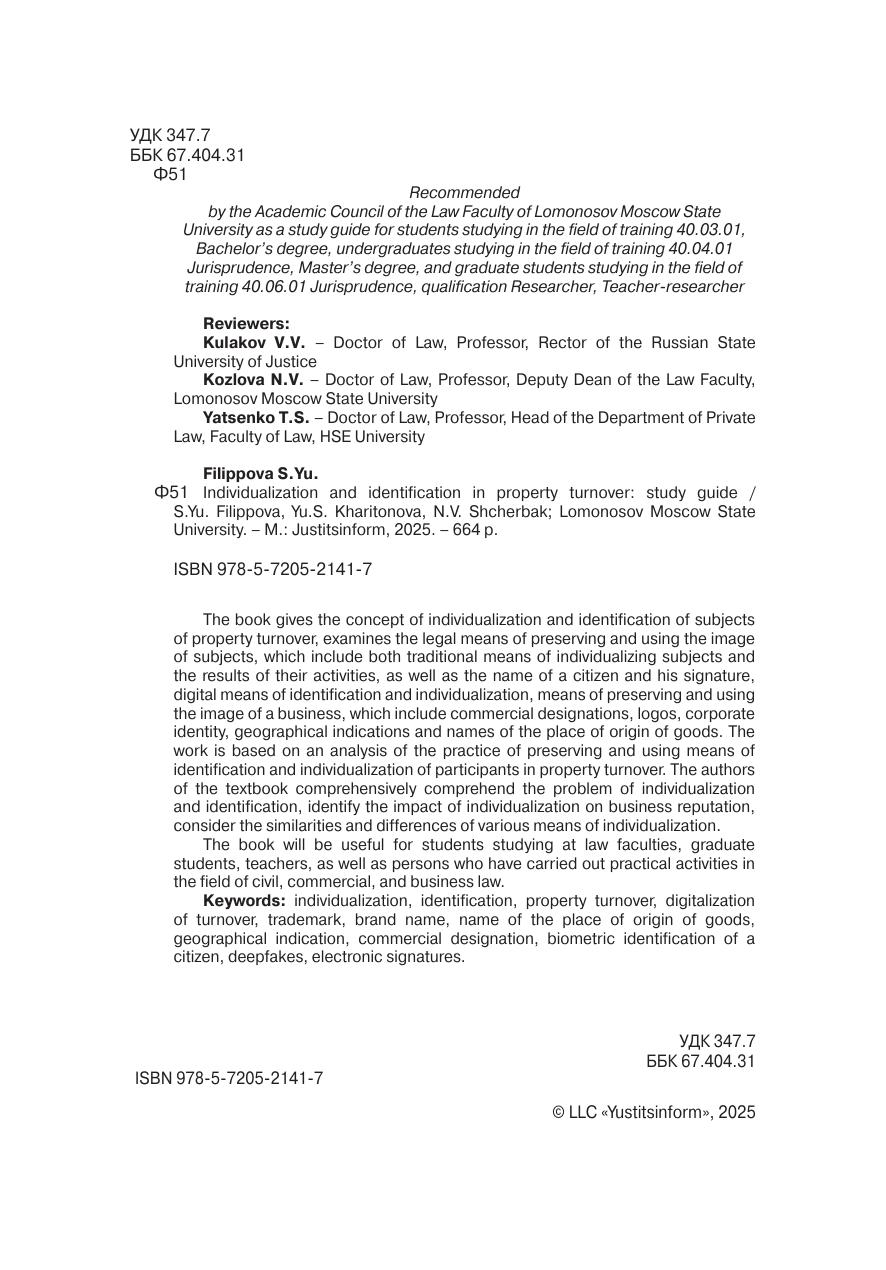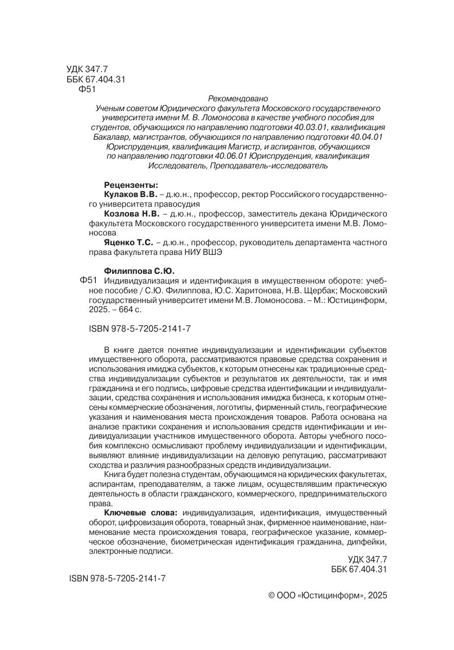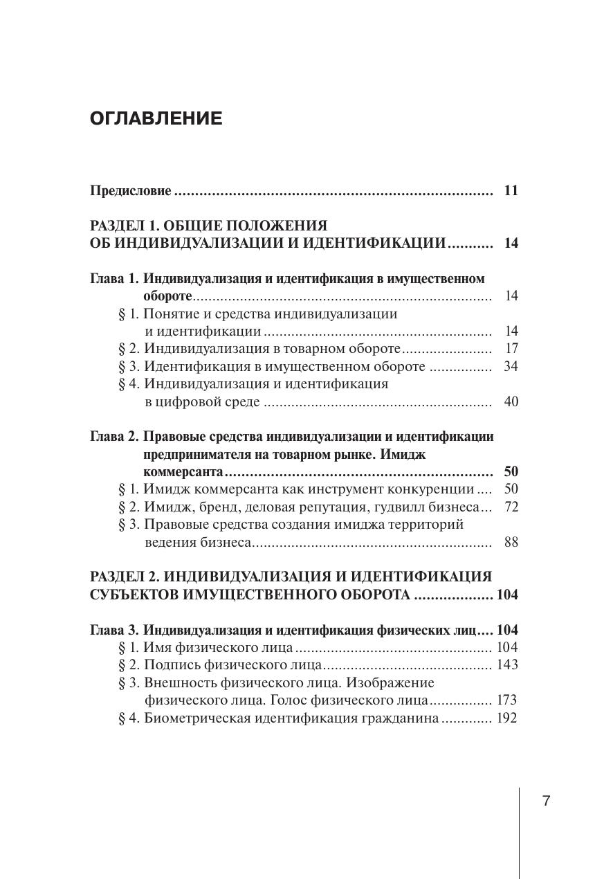 В книге дается понятие индивидуализации и идентификации субъектов имущественного оборота, рассматриваются правовые средства сохранения и использования имиджа субъектов, к которым отнесены как традиционные средства индивидуализации субъектов и результатов их деятельности, так и имя гражданина и его подпись, цифровые средства идентификации и индивидуализации, средства сохранения и использования имиджа бизнеса, к которым отнесены коммерческие обозначения, логотипы, фирменный стиль, географические указания и наименования места происхождения товаров. Работа основана на анализе практики сохранения и использования средств идентификации и индивидуализации участников имущественного оборота. Авторы учебного пособия комплексно осмысливают проблему индивидуализации и идентификации, выявляют влияние индивидуализации на деловую репутацию, рассматривают сходства и различия разнообразных средств индивидуализации. Книга будет полезна студентам, обучающимся на юридических факультетах, аспирантам, преподавателям, а также лицам, осуществлявшим практическую деятельность в области гражданского, коммерческого, предпринимательского права.