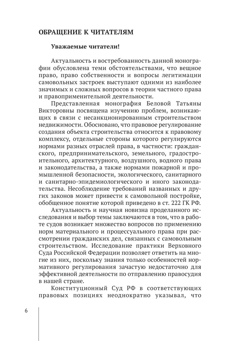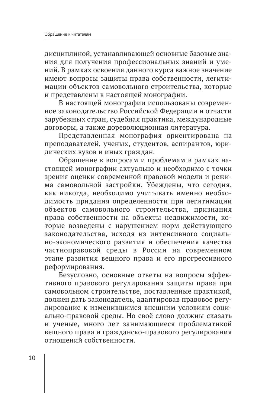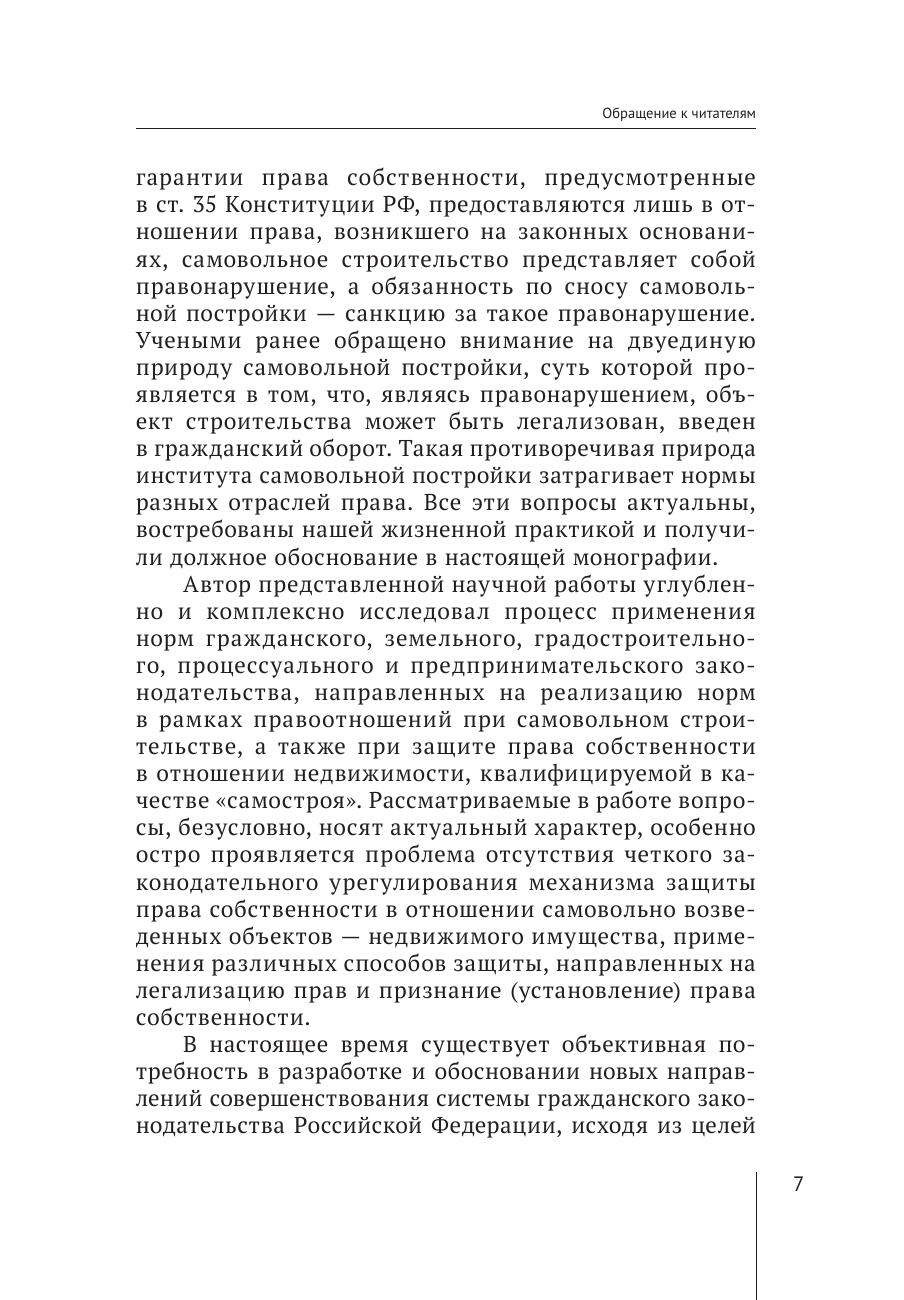 Актуальным направлением развития цивилистической науки и практики является определение сущности, правовой природы, способов защиты права собственности граждан и юридических лиц в отношении объектов недвижимости, признаваемых самовольными строениями. Правовые нормы, регулирующие вышеуказанные отношения, представляют собой предмет настоящего монографического исследования с учетом различной отраслевой принадлежности. В монографии представлен анализ законодательства, правоприменительной судебно-арбитражной практики и доктринальных подходов в отношении правового режима самовольной постройки в системе вещно-правовой защиты прав субъектов. Указанные вопросы заинтересуют не только юристов, но и обычных граждан, которые возводят новые объекты недвижимости или проводят реконструкцию. Монография рекомендована преподавателям, аспирантам и студентам вузов, практикующим юристам, а также рассчитана на широкий круг читателей.