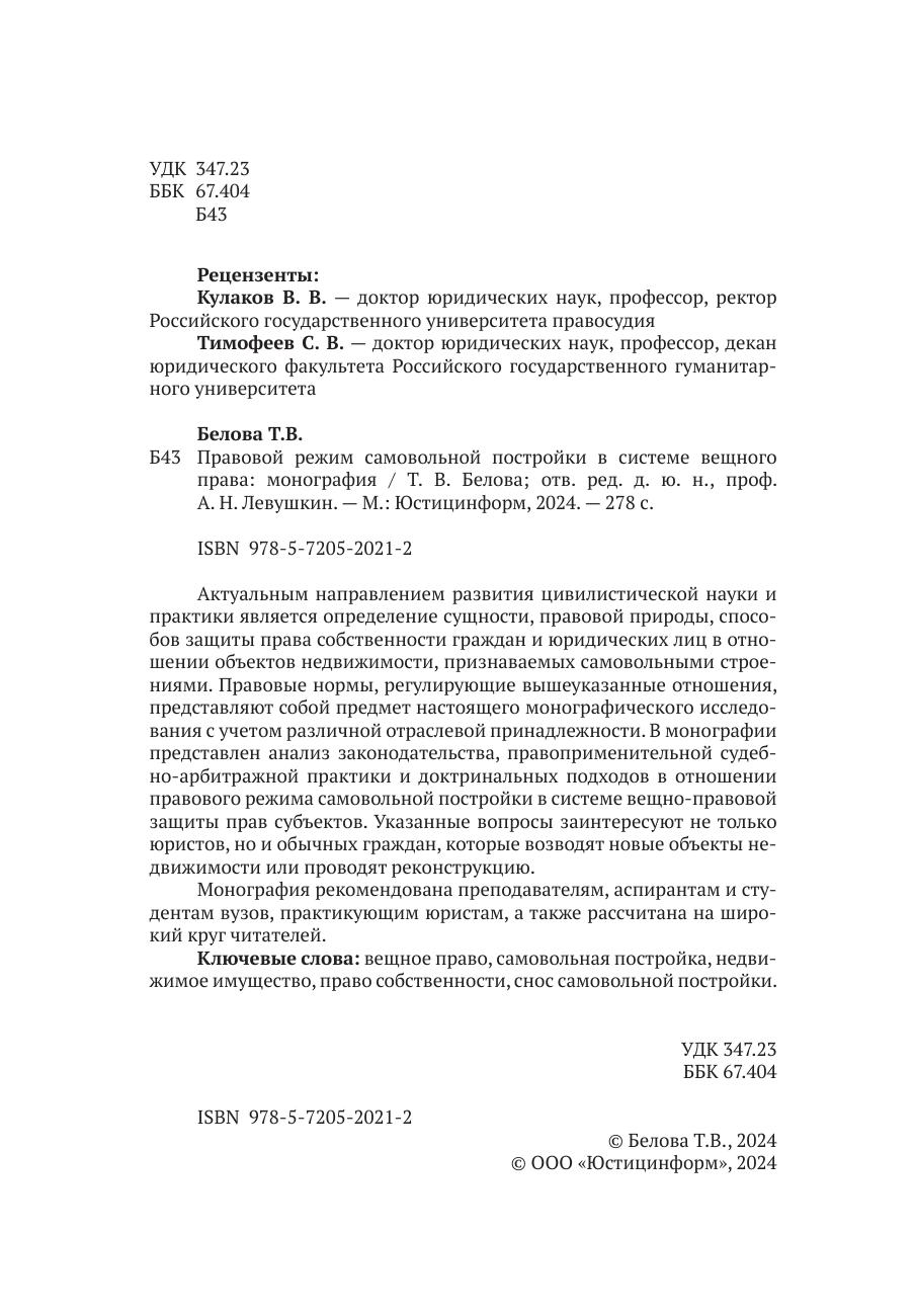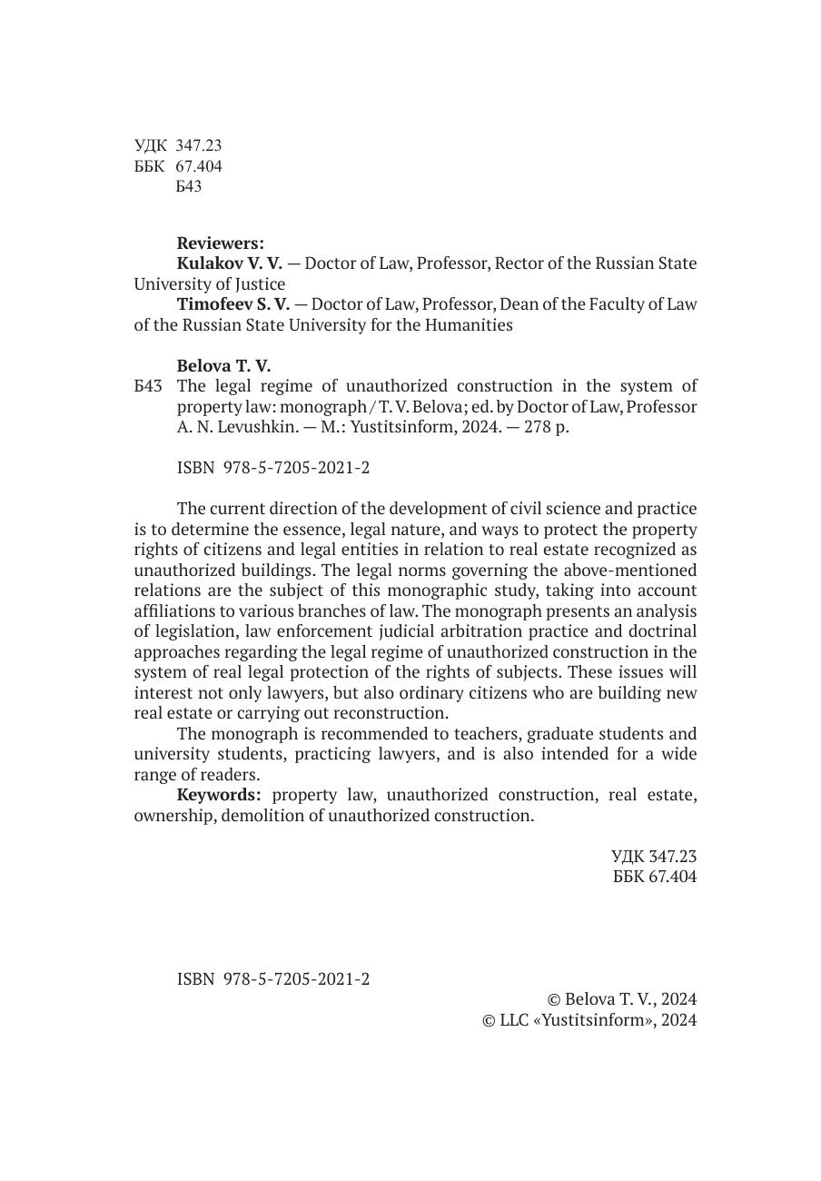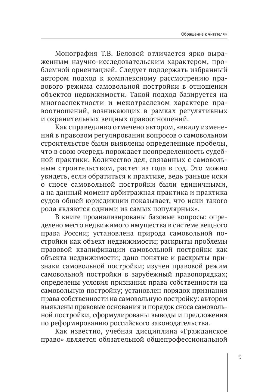 Актуальным направлением развития цивилистической науки и практики является определение сущности, правовой природы, способов защиты права собственности граждан и юридических лиц в отношении объектов недвижимости, признаваемых самовольными строениями. Правовые нормы, регулирующие вышеуказанные отношения, представляют собой предмет настоящего монографического исследования с учетом различной отраслевой принадлежности. В монографии представлен анализ законодательства, правоприменительной судебно-арбитражной практики и доктринальных подходов в отношении правового режима самовольной постройки в системе вещно-правовой защиты прав субъектов. Указанные вопросы заинтересуют не только юристов, но и обычных граждан, которые возводят новые объекты недвижимости или проводят реконструкцию. Монография рекомендована преподавателям, аспирантам и студентам вузов, практикующим юристам, а также рассчитана на широкий круг читателей.