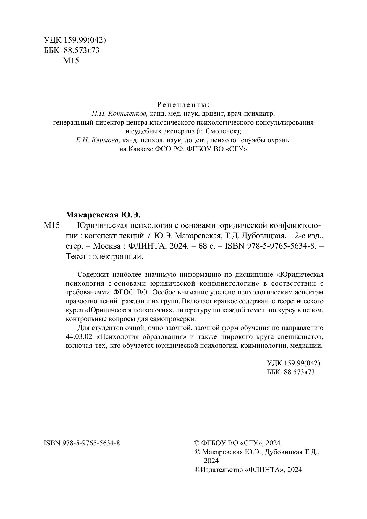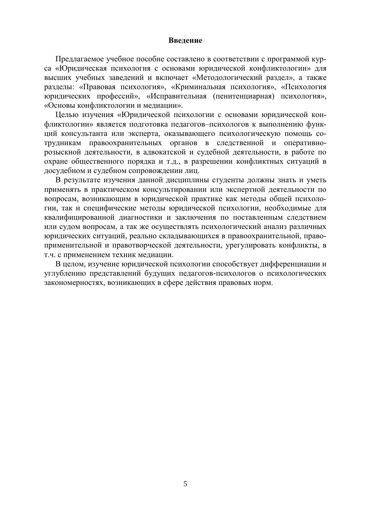 Содержит наиболее значимую информацию по дисциплине «Юридическая психология с основами юридической конфликтологии» в соответствии с требованиями ФГОС ВО. Особое внимание уделено психологическим аспектам правоотношений граждан и их групп. Включает краткое содержание теоретического курса «Юридическая психология», литературу по каждой теме и по курсу в целом, контрольные вопросы для самопроверки. Для студентов очной, очно-заочной, заочной форм обучения по направлению 44.03.02 «Психология образования» и также широкого круга специалистов, включая тех, кто обучается юридической психологии, криминологии, медиации.